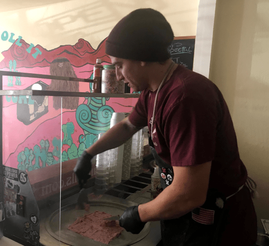 Ice cream made on a cold plate in front of you.