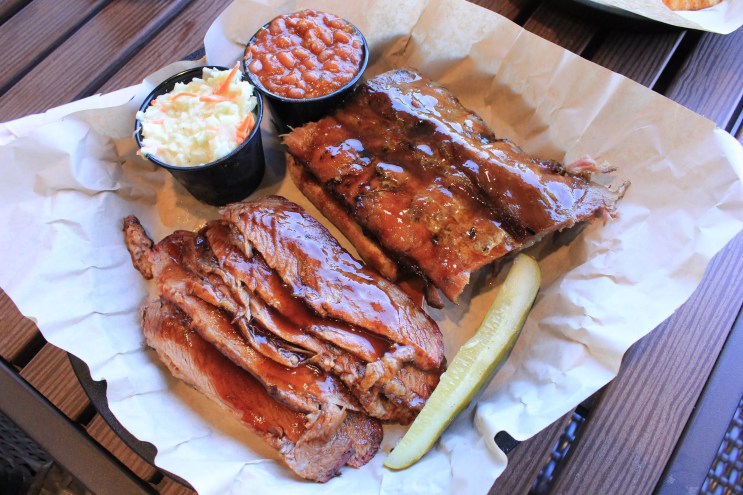 Pork-centric barbecue is smoked in concrete pits over almond wood.