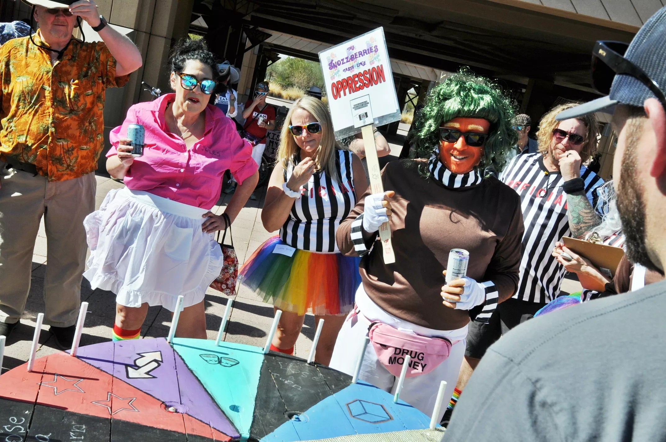 The Oompa Loompas of the "No More Chocolate-Tears" team protest along Grand Avenue during the 2025 Phoenix Idiotarod.