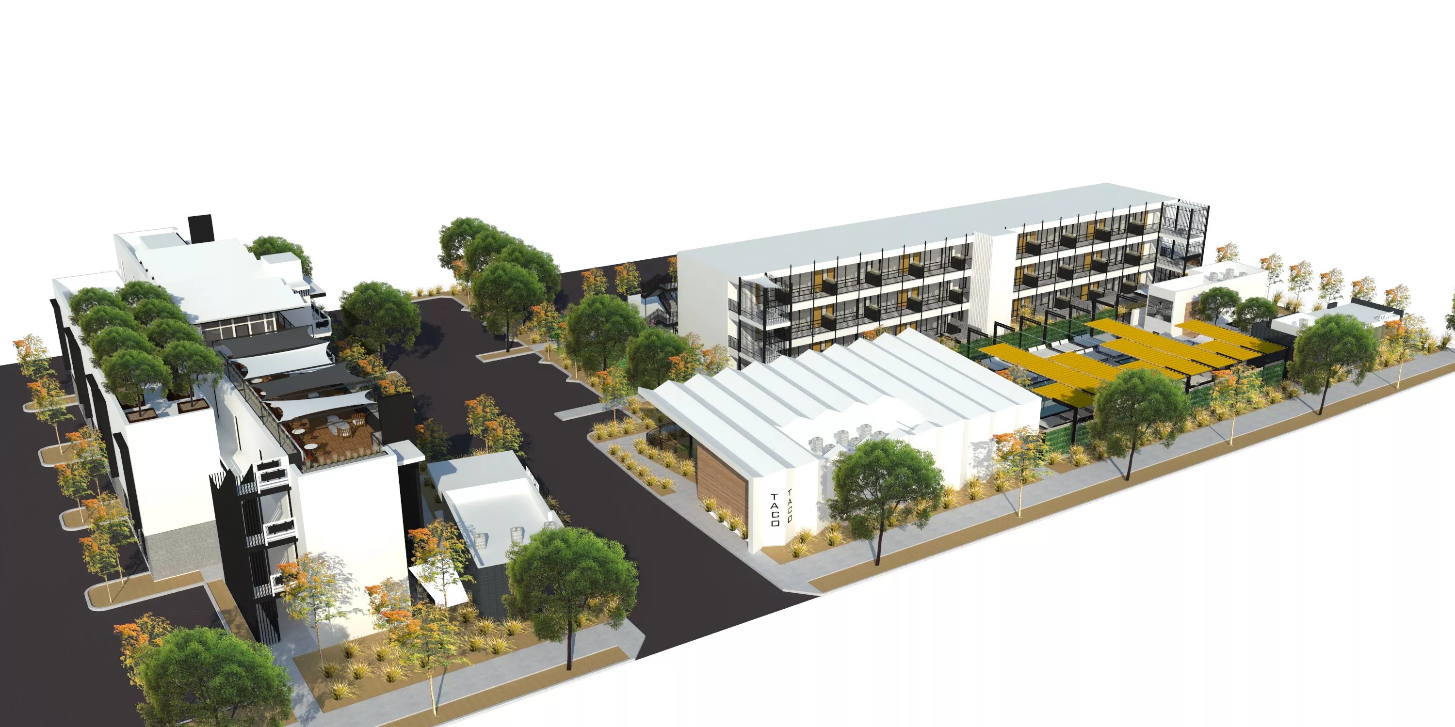 The adaptive-reuse project will combine two Midcentury Modern mid-rise buildings to create a 79-room hotel with a rooftop bar, as well as a taco bar, ice creamery, and coffee shop.