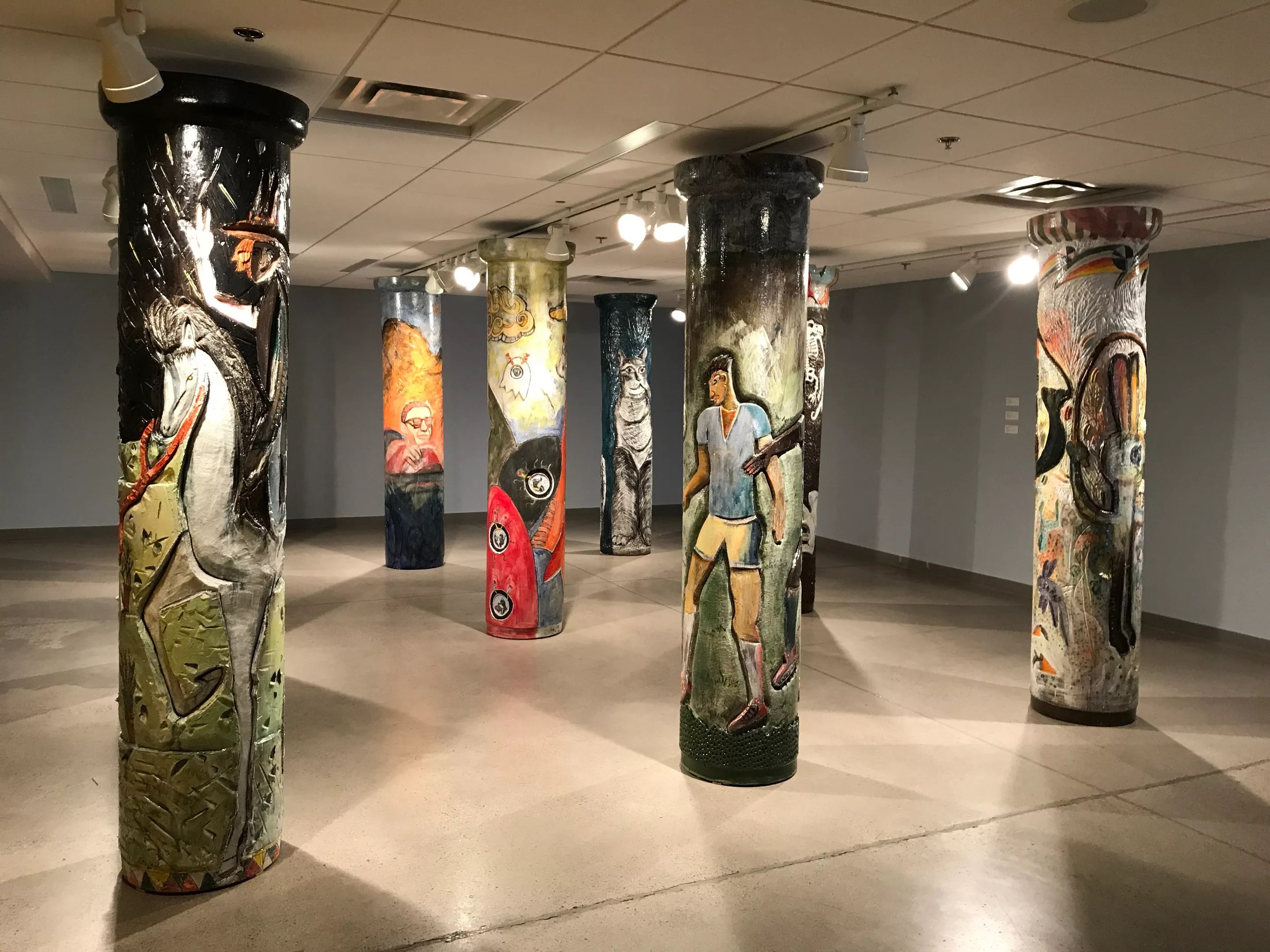 Nine sewer pipes stand like columns inside the ASU Art Museum’s Ceramics Research Center. Created with vitrified clay, they’ve been transformed into art objects. Each pipe measures about 7 1/2 feet tall.