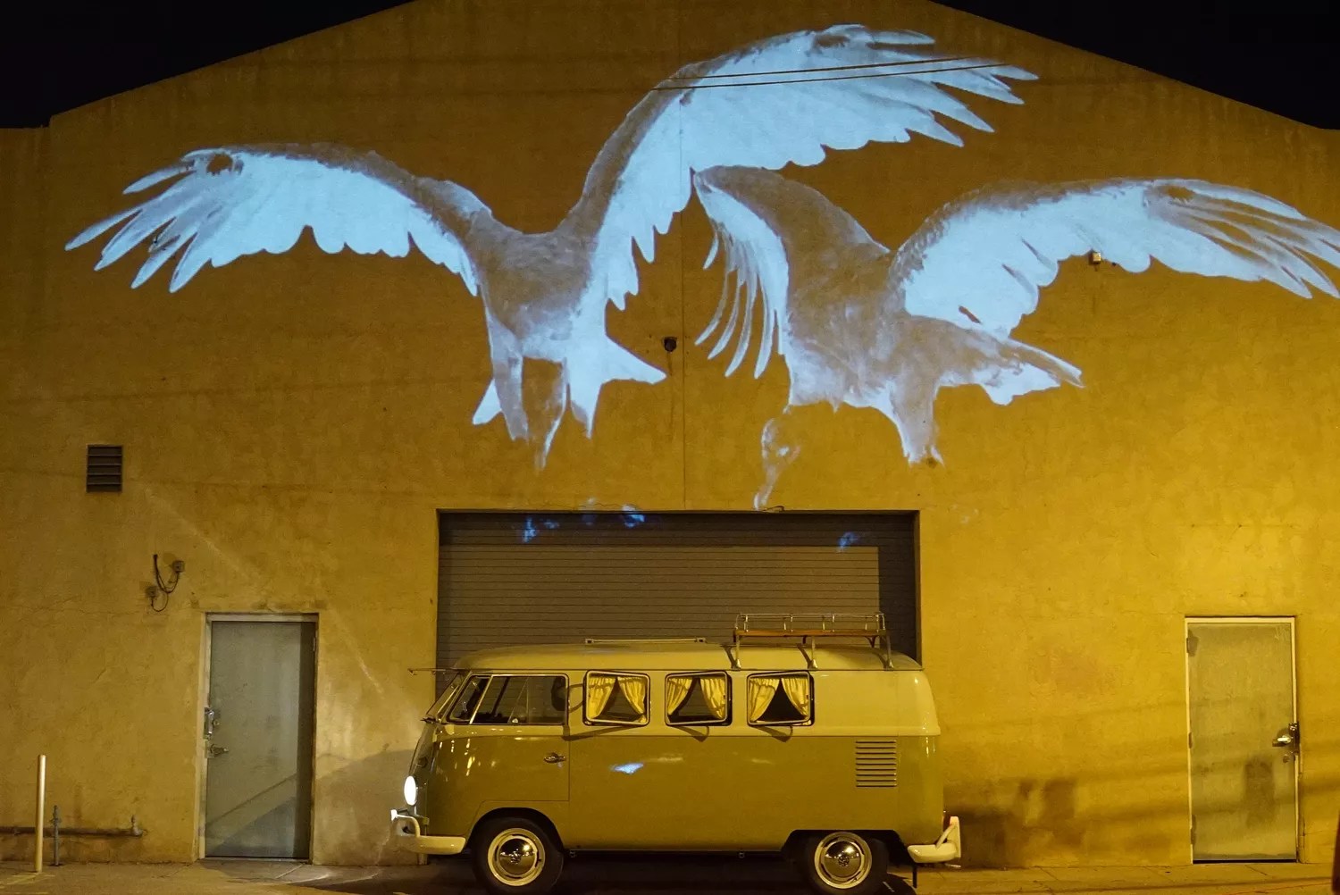 For the “Chaos Theory 15″ exhibition in 2014, they projected images of vultures taking flight onto an exterior wall at Legend City Studios, revealing the beauty of the birds that many people find repulsive.