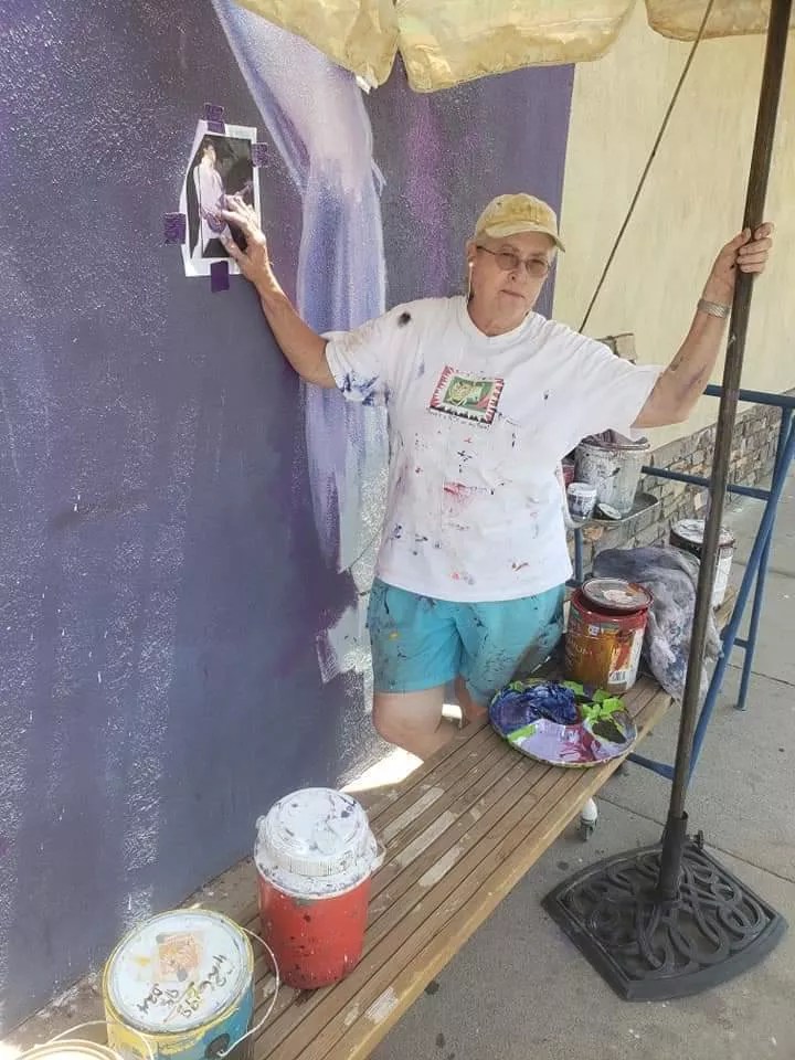 Maggie Keane early in the two-month process of painting her Prince mural.