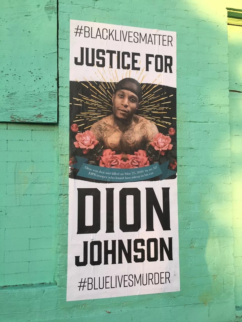Often, protesters hold signs bearing the names of black community members killed by police officers – including George Floyd and Dion Johnson. Both men died on May 25 – Floyd in Minneapolis and Johnson in Phoenix. Both are being remembered through artworks installed in public places.
