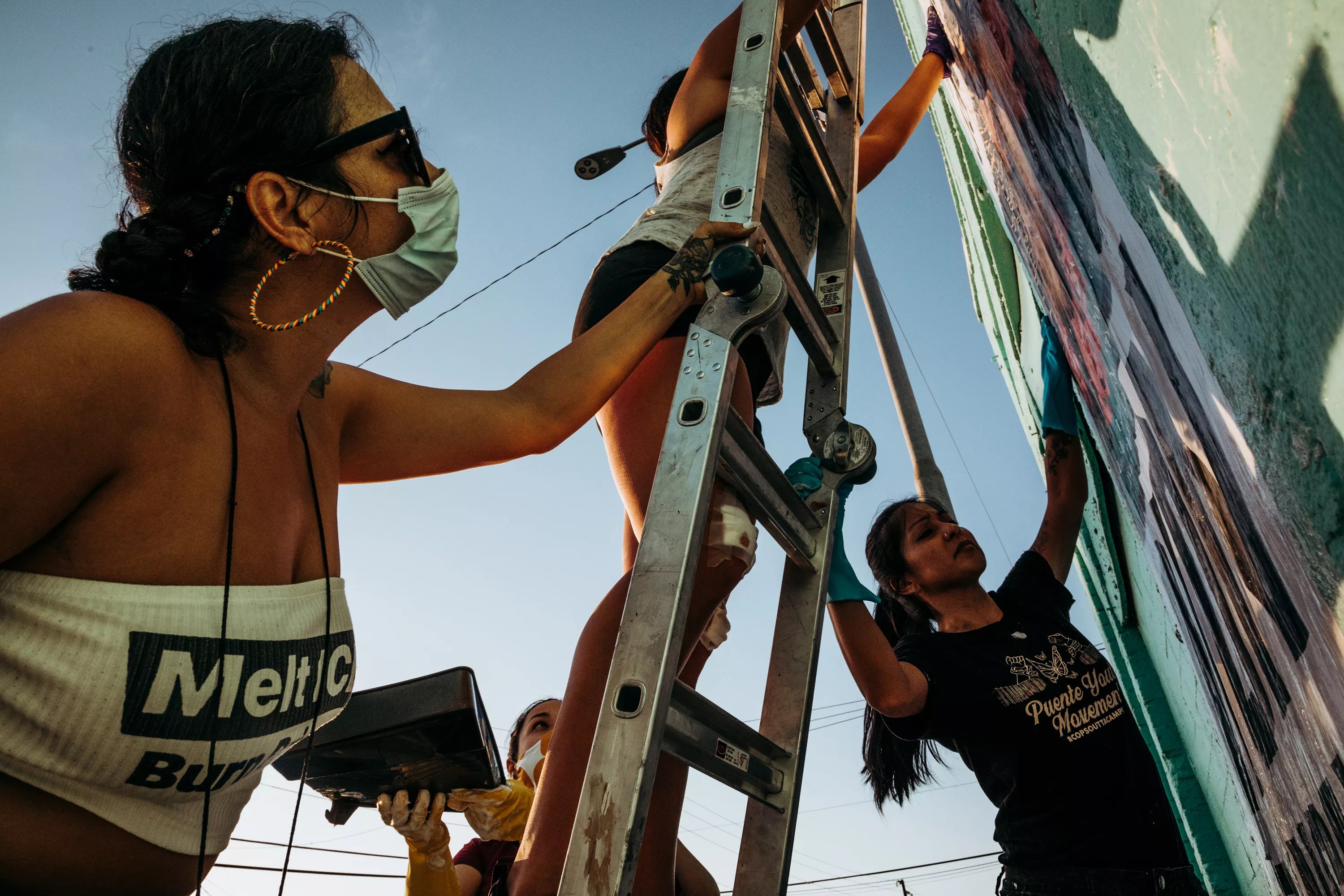 Meanwhile, Lucinda Yrene was working on a fresh mural for Barrio Café, and making plans for the next phase of a new mural project inspired by the Black Lives Matter movement. Recently, Yrene approached Beatrice Moore, an artist who owns properties along Grand Avenue, and asked if there were any walls where she could create new street art.