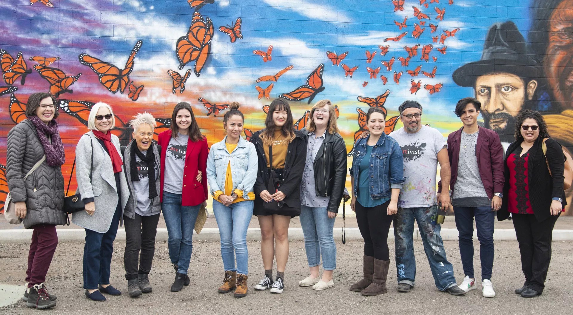 Students in the ASU Humanities Lab with a mural they painted with artist Hugo Medina.