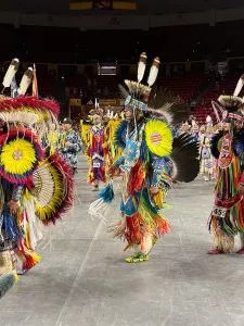Drum groups representing different tribal nations circling the gym floor, regalia draped over the stadium chairs and the clinks of jingles on dresses all contributed to the lively atmosphere.