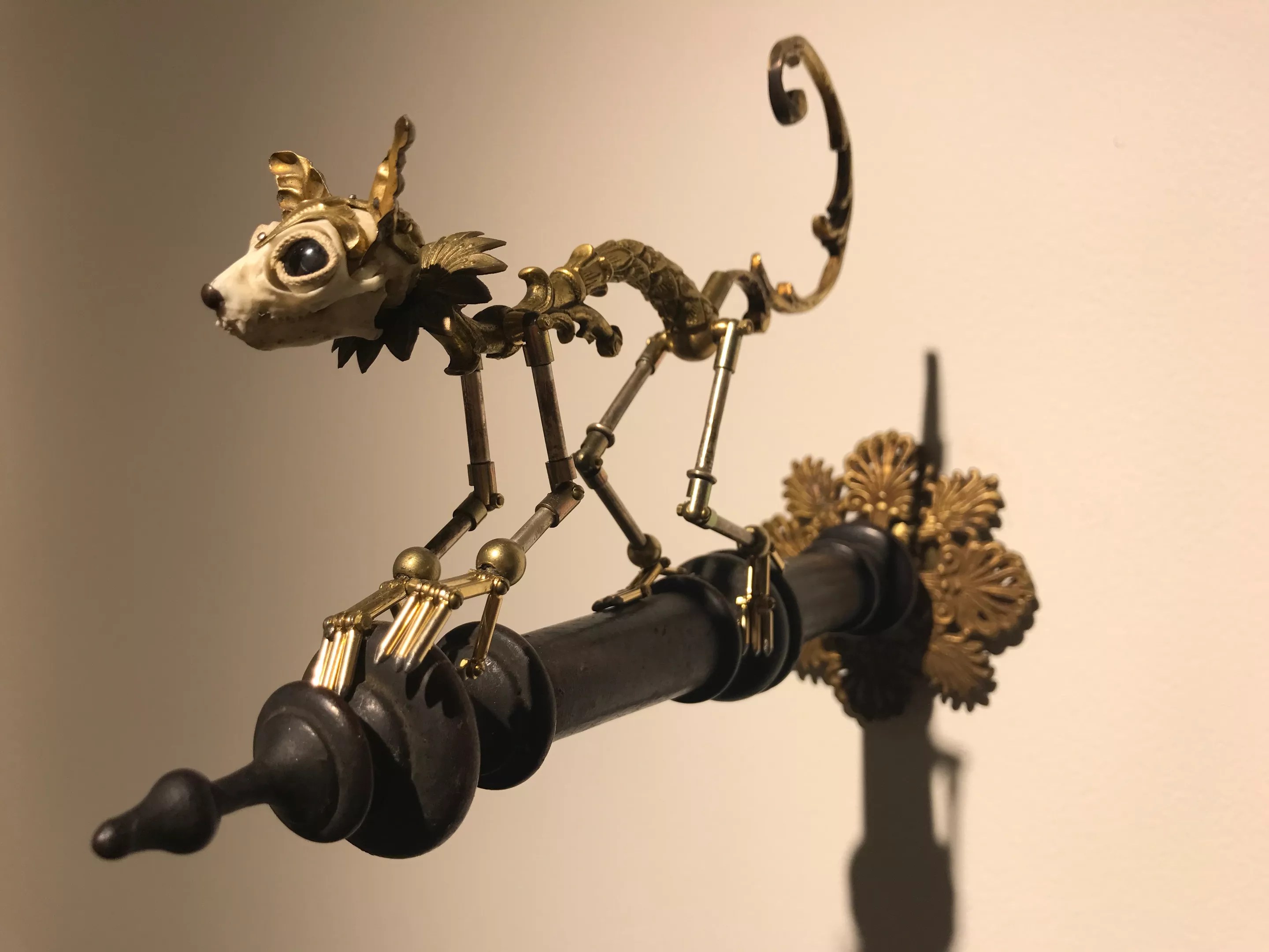 One of many Jessica Joslin works exhibited at Lisa Sette Gallery, this delicate sculpture was created in 2017 with antique hardware and findings, including brass, silver, wood, cast plastic, glove leather, and glass eyes. It’s part of an exhibition that continues through August 26.