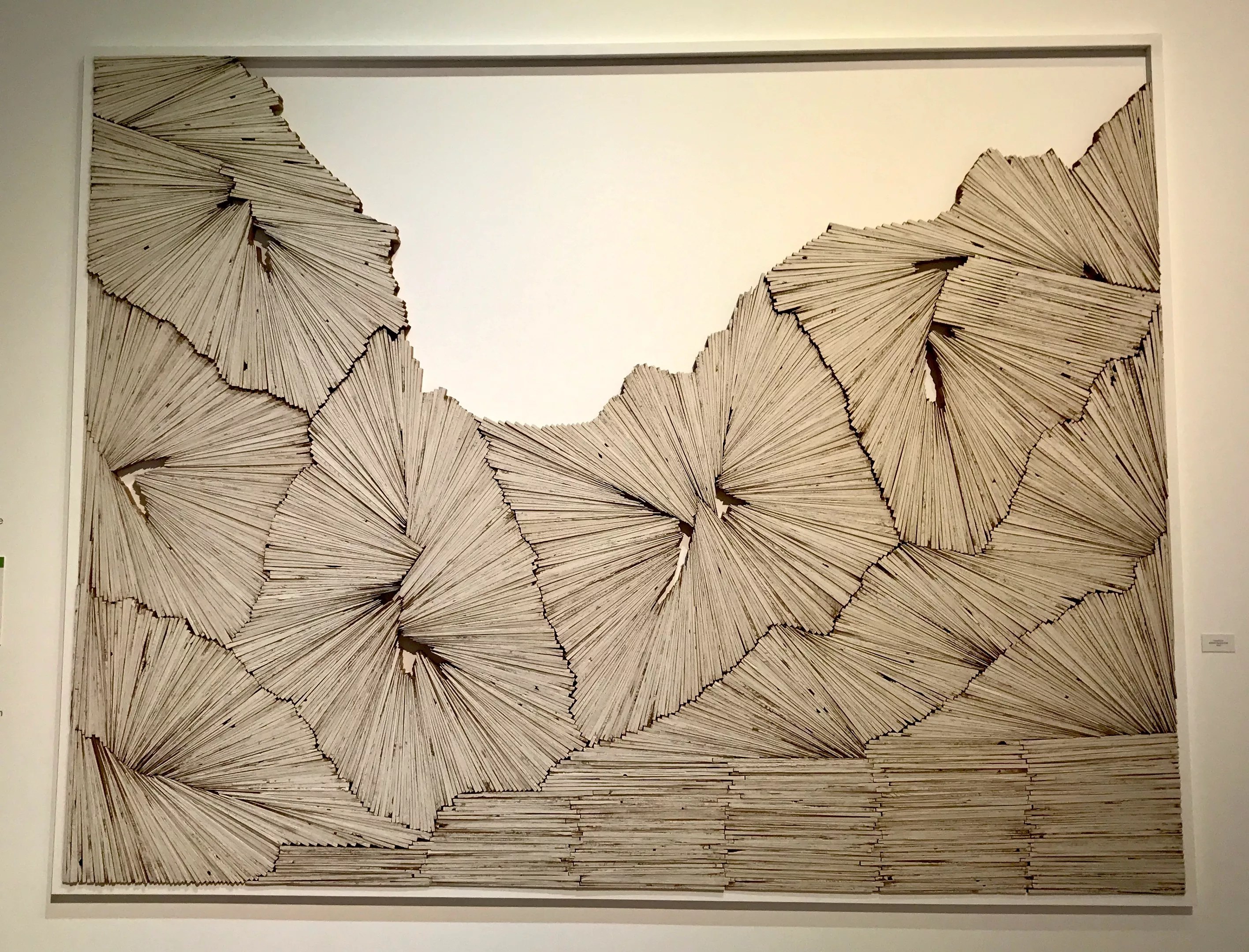 Christine Lee, an artist deeply committed to reuse and recycling in her art practice, created this piece using wooden scrims. They’re placed to stay in order without glue, so Lee will be able to use the pieces for future art projects. This work is featured in the “Biomimicry: Nature Imitates Design” exhibition in The Gallery at Tempe Center for the Arts.