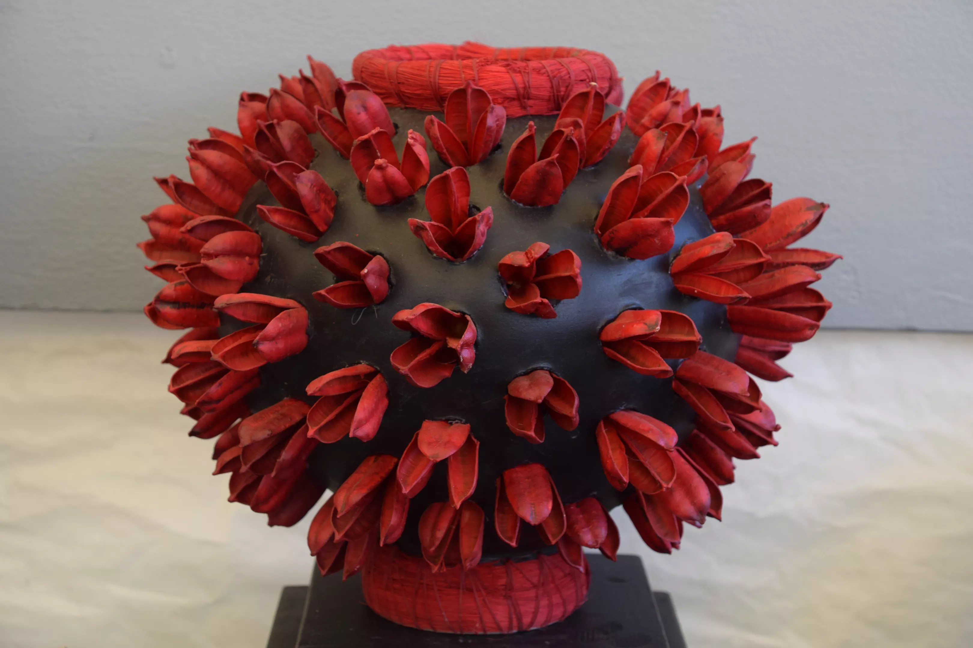 Ceramic artists Michael and Christine Adcock of Santa Barbara, California, showed this piece during the Scottsdale Arts Festival. It’s a hand-thrown and altered, pit-fired stoneware vase inlaid with dyed seeds pods of the Blue Agave (also called the Century Plant). The foot and rim were created with dyed Lechuguilla fiber.