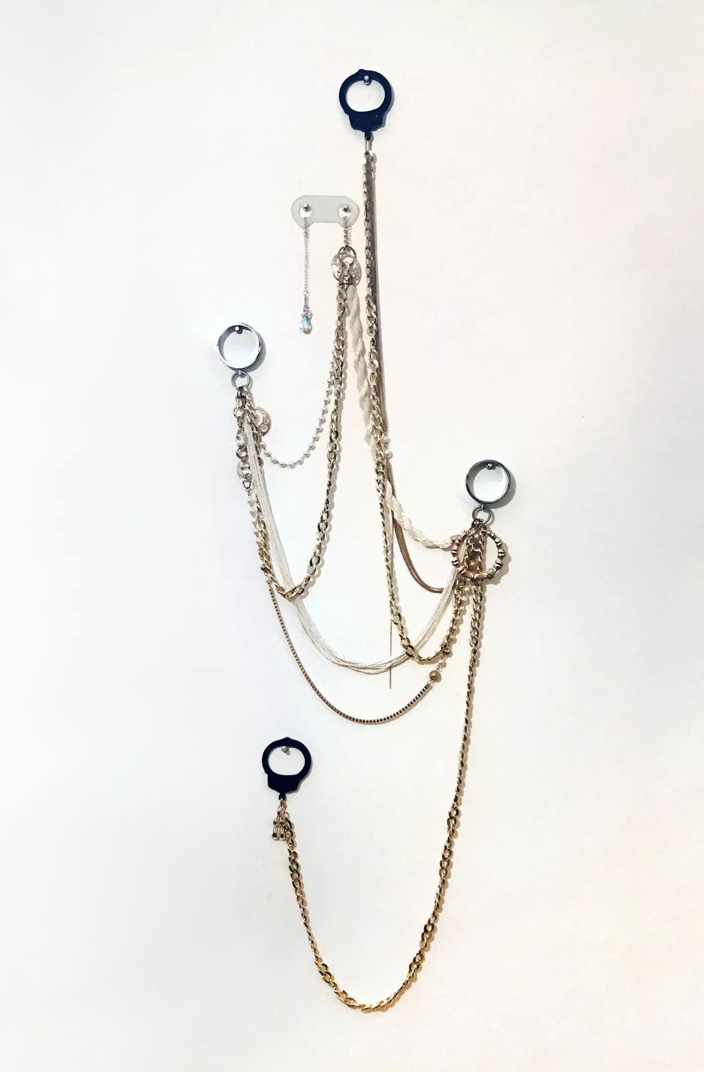 For his newest series, Brooklyn-based Kambui Olujimi created this installation of adorned handcuffs that “act as lyrical drawings to highlight the plight of mass systemic incarceration and the ties between those caught within a cycle they cannot escape.” It’s featured in the “Tell Me Why, Tell Me Why, Tell Me Why (Why Can’t We Live Together?)” exhibition that continues through April 29 at Lisa Sette Gallery.