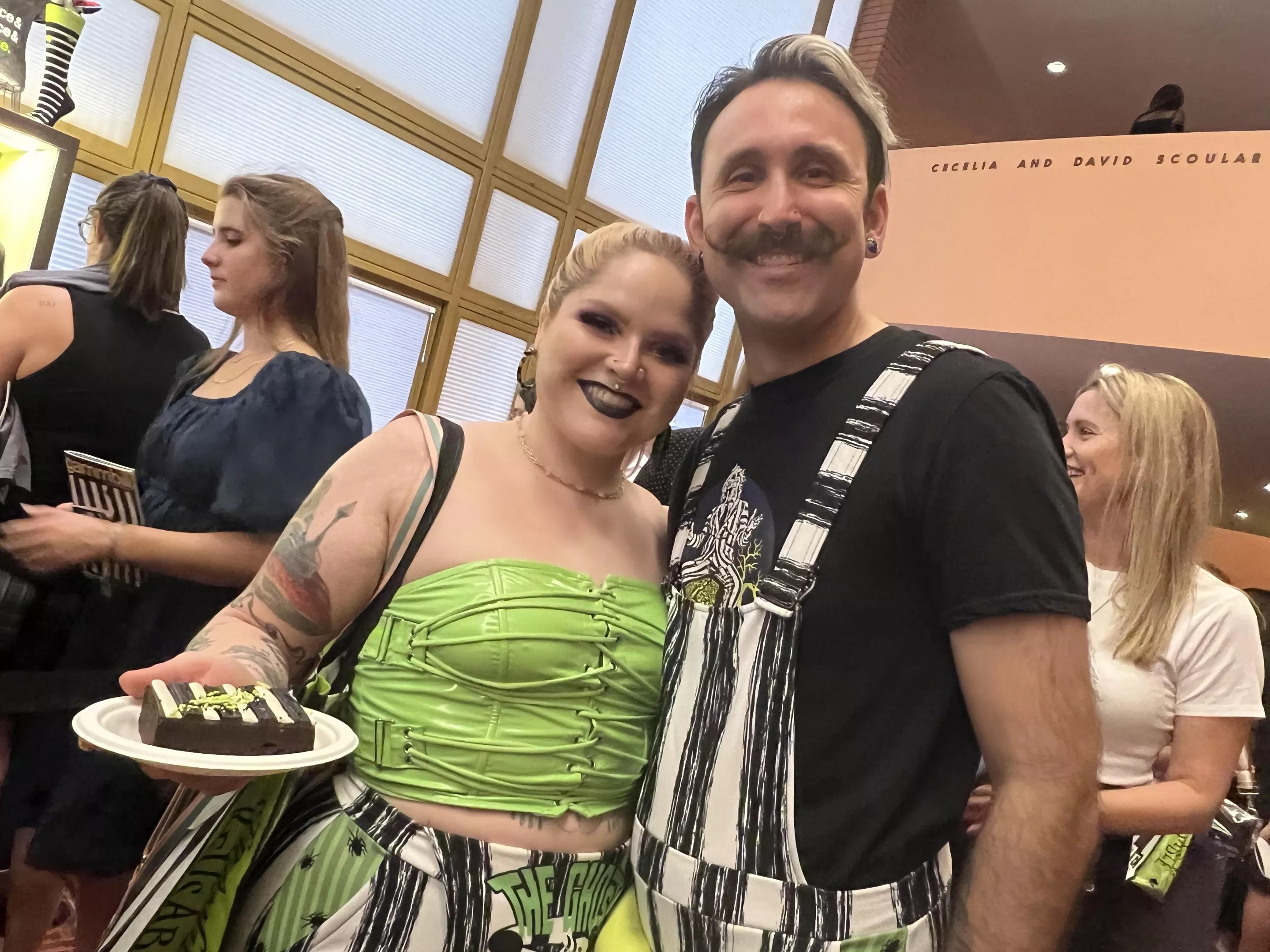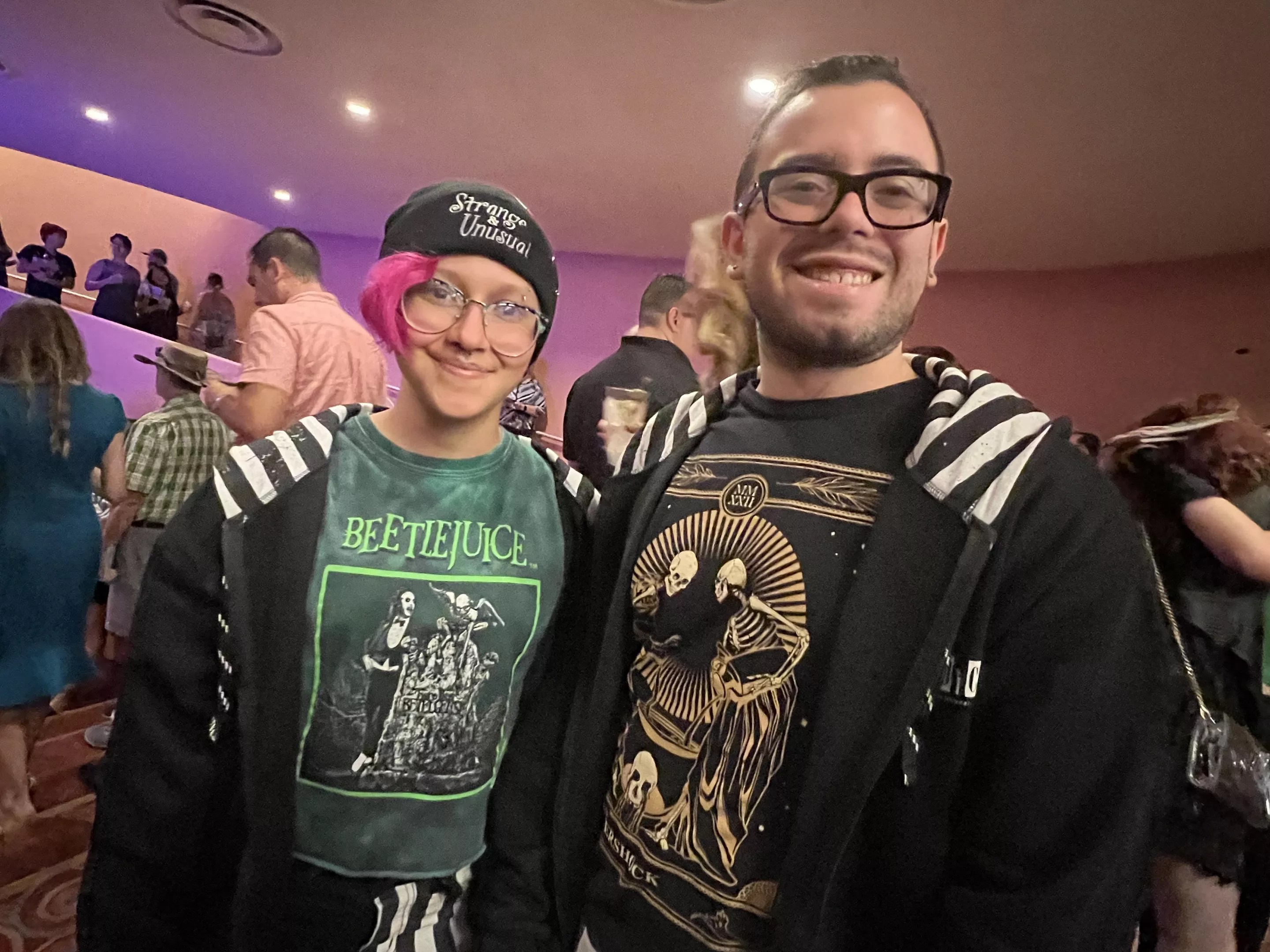Matching Beetlejuice pajamas make for a comfortable theater experience.