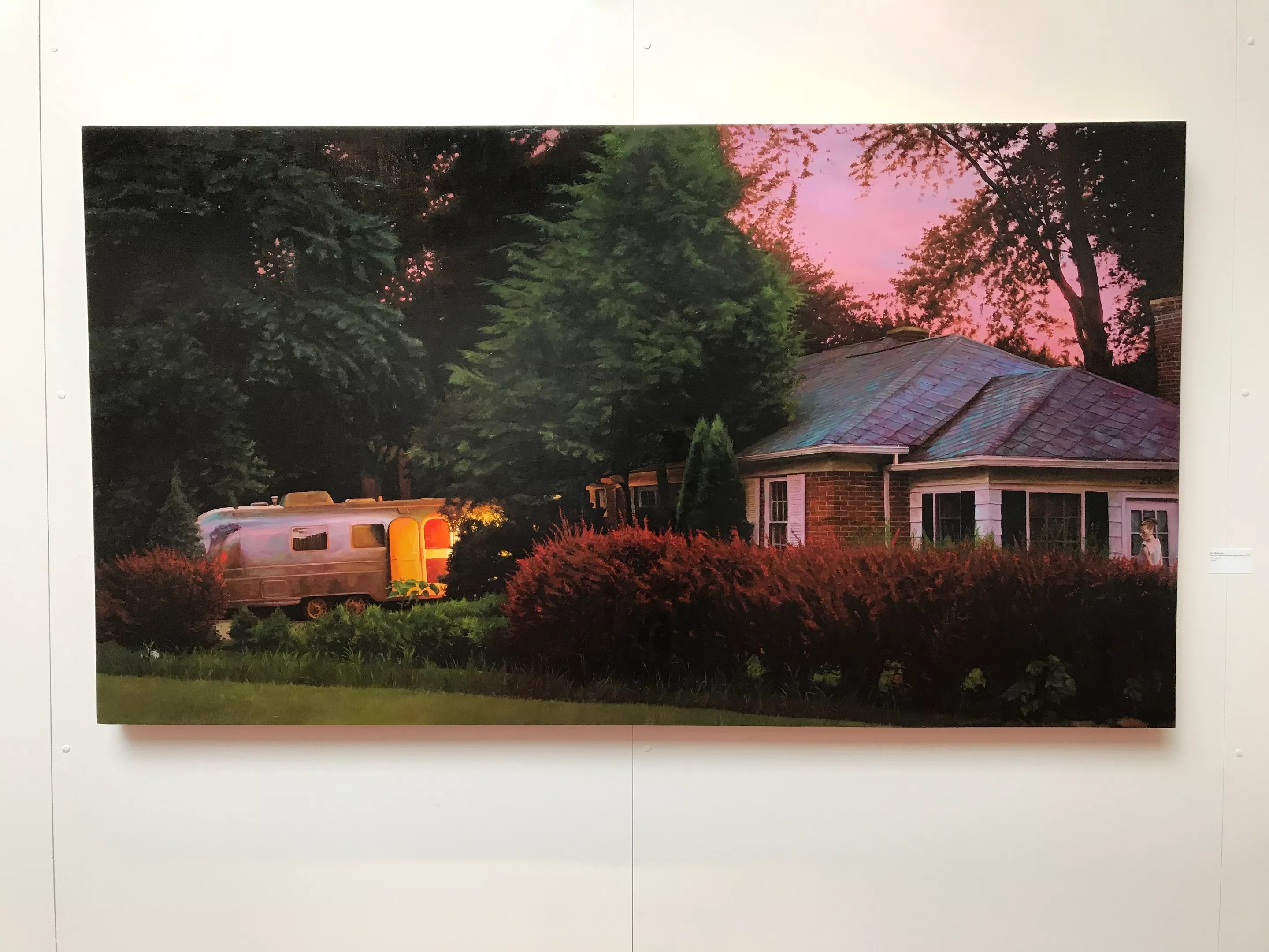 This is one of several oil paintings by Cam DeCaussin featured in a recent exhibition titled “When You Weren’t Looking,” which also included real and imagined landscapes by Laura Spalding Best. The exhibition, curated by Peter Bugg, was on view at the art gallery inside Chandler Center for the Arts.