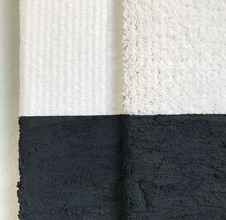 Sazdanoff utilizes everyday materials, like linen and concrete, that are woven together to create a three-dimensional texture across her canvas. Her minimalist, mixed-media work aims to create a tangible balance of fluidity and contrast.