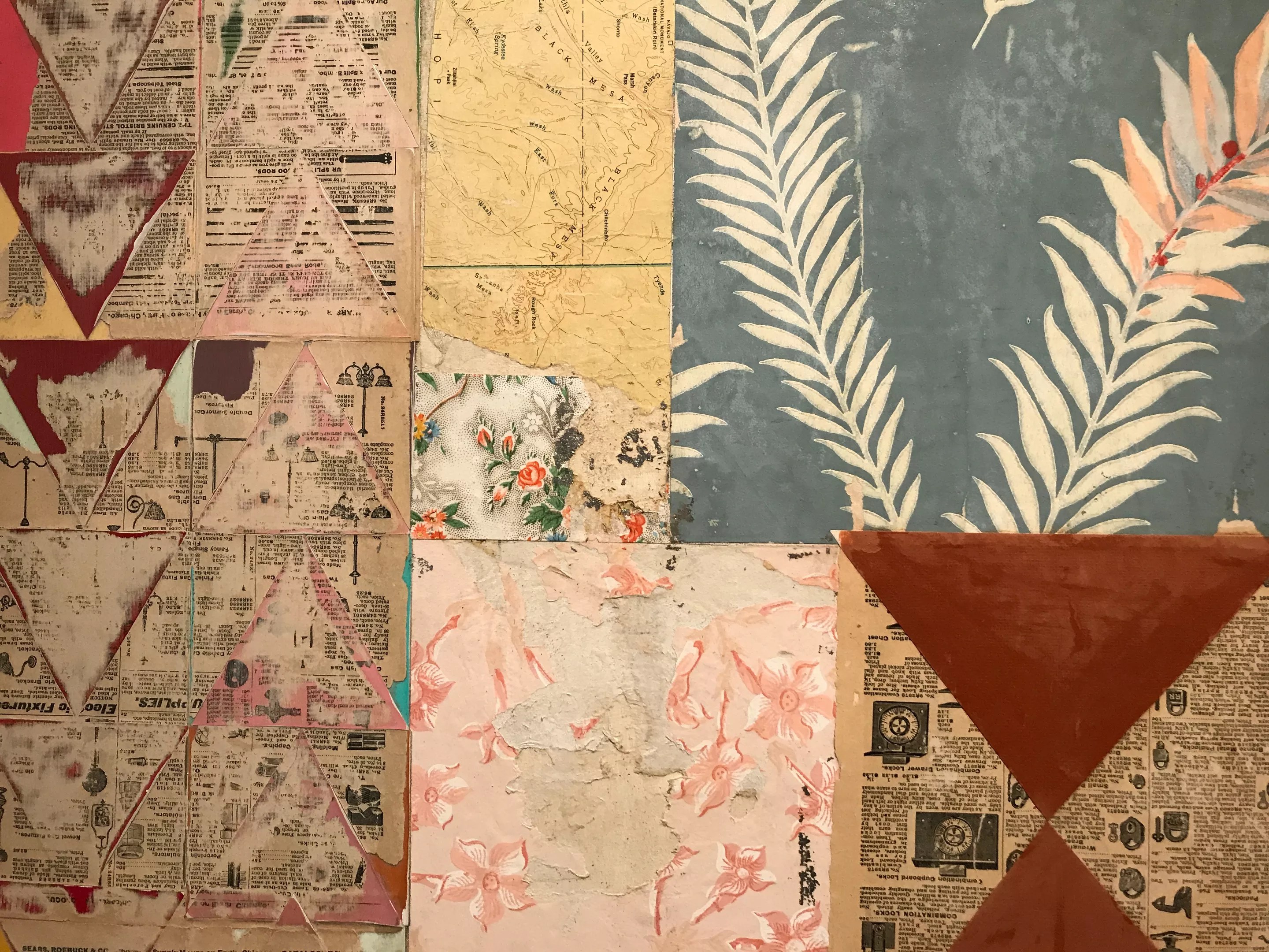“I seek to peel back layers to reveal the past and to explore the strength and struggles that my family endured,” Plecas says in exhibition materials. Often, her work includes repeated shapes and patterns, created with materials such as old papers and book pages.