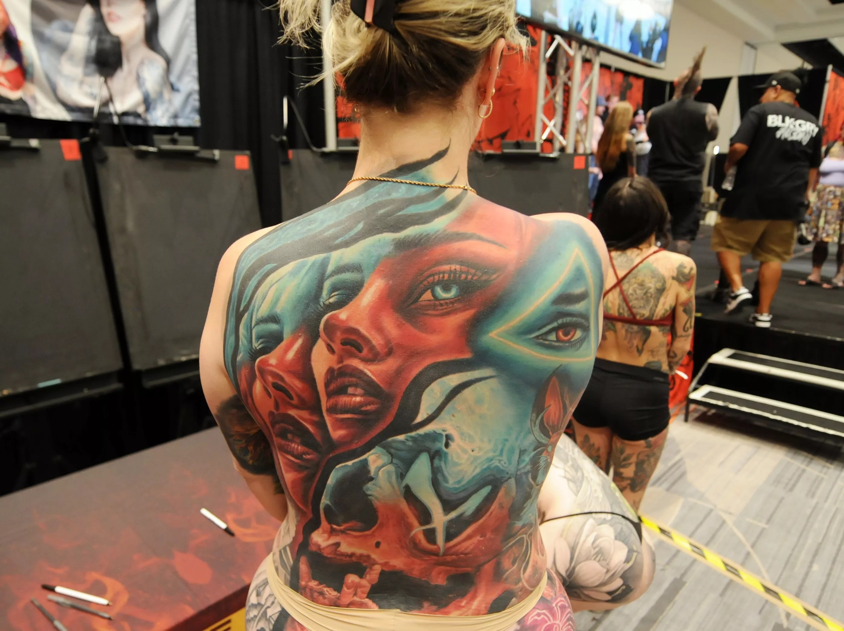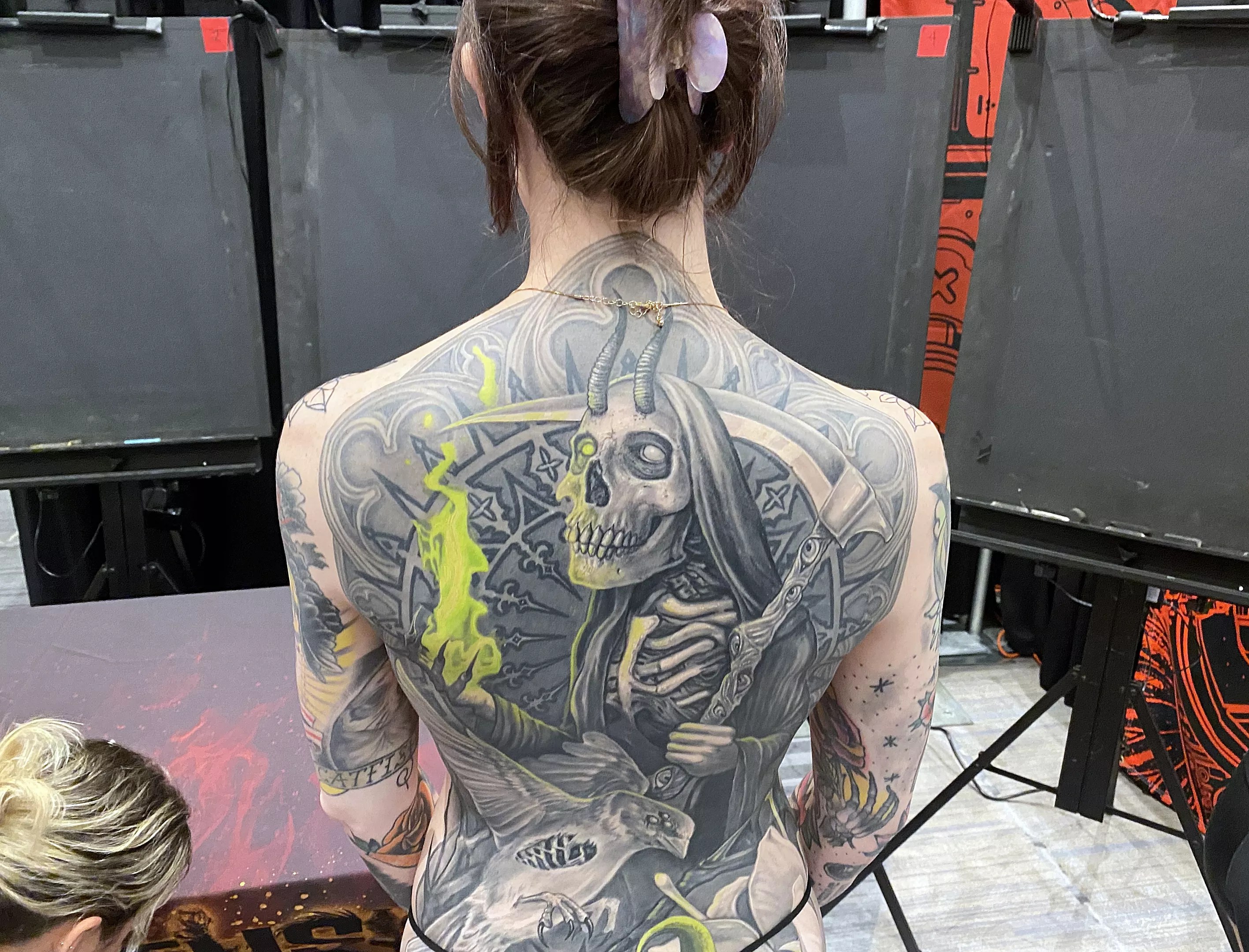 The love of tattoos spanned generations at Hell City 2025. Lisa Mitchell, a 65-year-old resident of Los Angeles, proudly showed off her massive dragon back piece by Brett Herman of Tribute Tattoo in California. She even had some advice for anyone still hesitating about going under the needle.