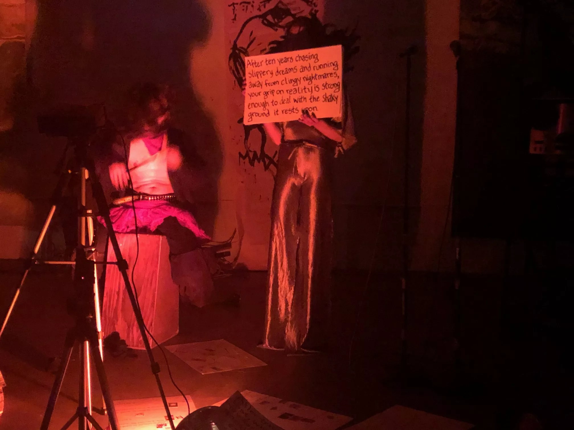 It was 45 minutes of multidisciplinary madness. The Arcana Collective contributed spoken word and stilt-walking high-jinks (with a musical assist on keyboards by the ubiquitous Andrew Jemsek). A typewriter and banjo dueted in blacklight, and guest singer Andrea Garber dropped some stunning operatic vocals for the song “Che Fiero Costume.” The band performed a few numbers, ranging from group noise pieces where drums, electronics, stringed instruments, and even something that looked like a dildo were used to generate a transfixing racket.