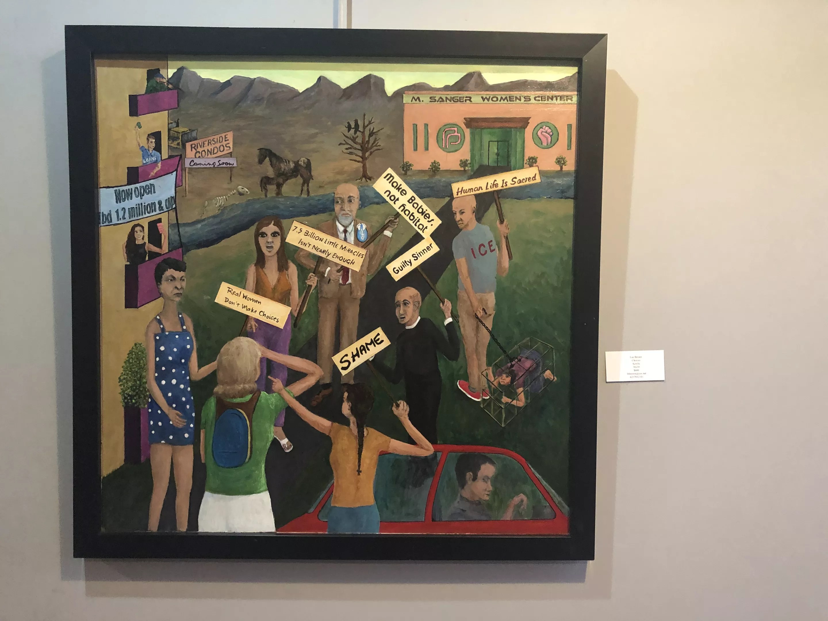 Choices, by artist Lee Brown, used acrylic paints to depict a protest of townspeople blocking a woman from her local Planned Parenthood with pro-life activism signs meant to shame her. One of the protesters is even holding a sign that says “Human Life is Sacred” while wearing an ICE shirt and dragging a child in a dog cage behind him. The exhibit will be at First Studio through March’s Third Friday. Sara Edwards