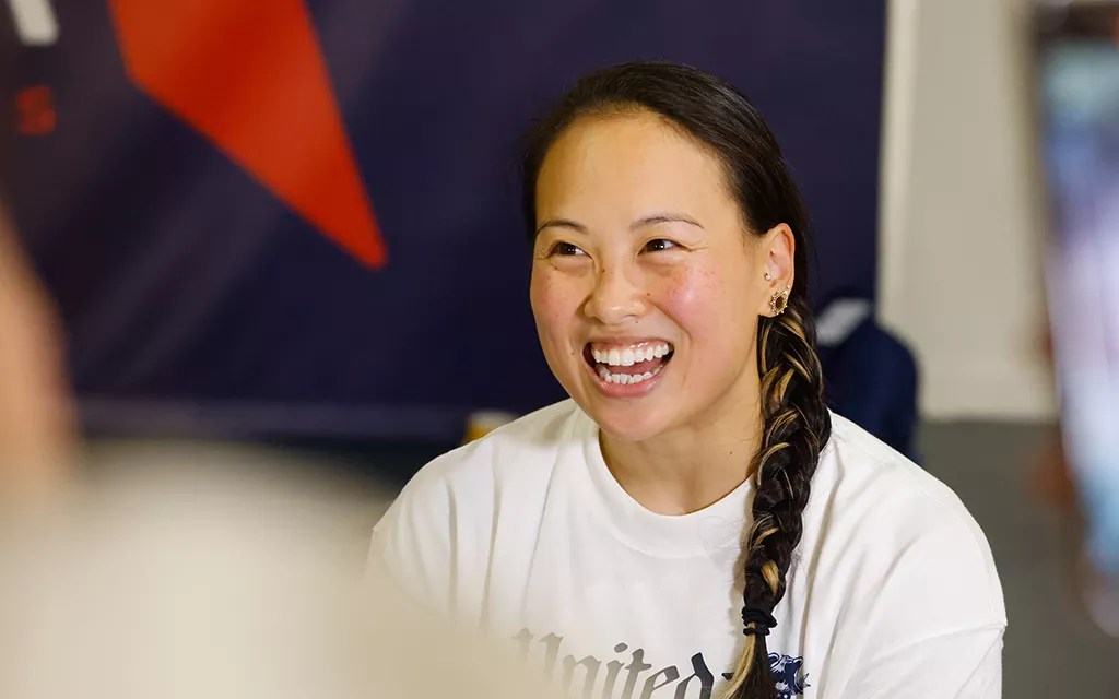 U.S. Olympic team breaking athlete Sunny Choi laughs while answering questions during an open practice at the High Performance Center in Paris.