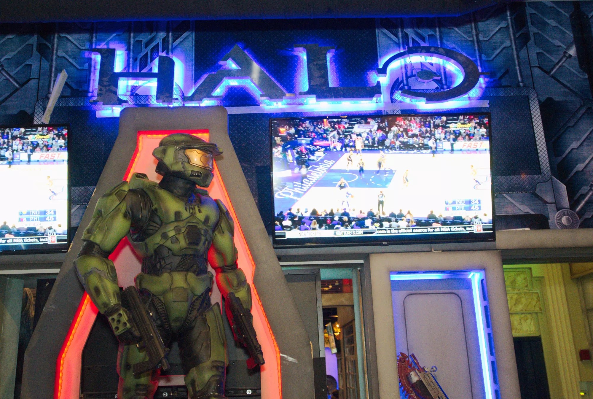 The bar also hosts a large display dedicated to the Halo game series and Master Chief, including a collection of 16 of his signature helmets arranged in an artful fashion.