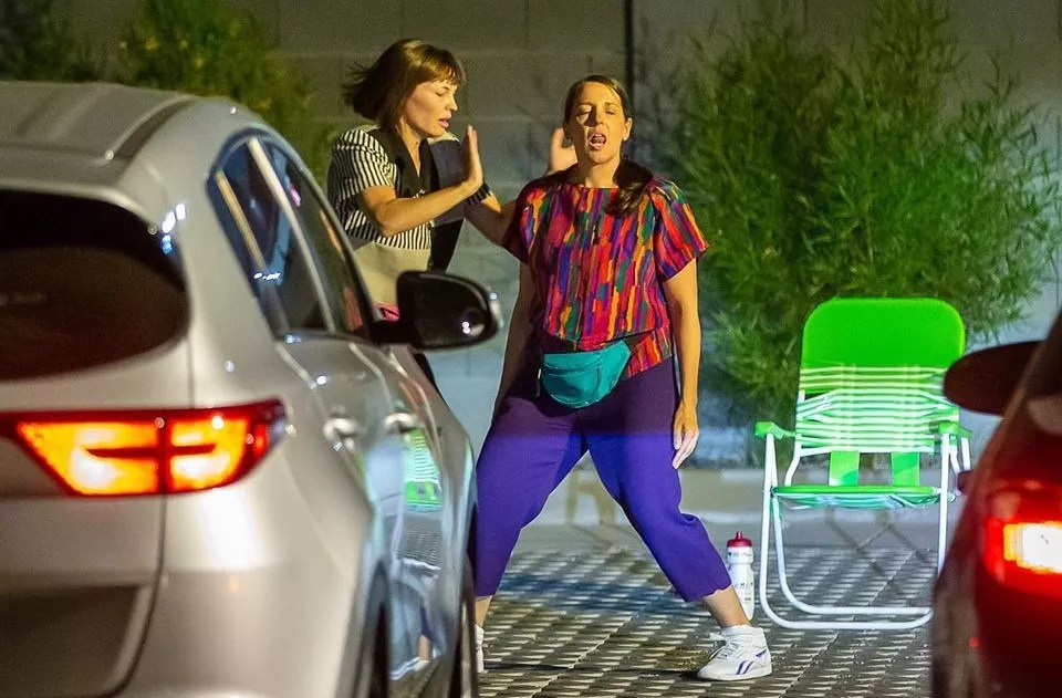 Lately, they’ve taken to local parking lots for the pandemic-inspired Ladies in the Headlights show, where the setup is as unusual as their performance. Ticketholders are given 24 hours’ advance notice of the venue location. The 15-minute shows are illuminated by the audience’s high beams. A soundtrack of mellow jazz and uptempo plays over 88.1 FM while the pair dance around lawn chairs and pantomime a hand-washing routine as a narrator describes their inner musings.