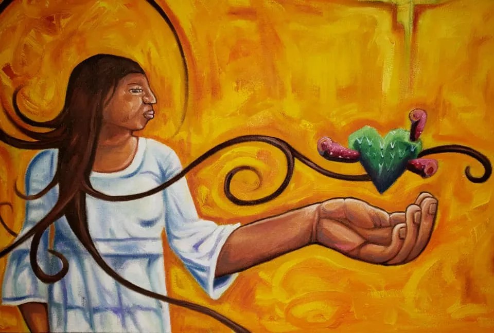 Despite their struggles, Fernandez saw young women filled with hope. “No matter what they’ve gone through, they still want to try and cross the border again,” he says. That’s the feeling he’s tried to convey with a pair of paintings created for the exhibit, which runs through Saturday, September 29, at The Sagrado Galleria.