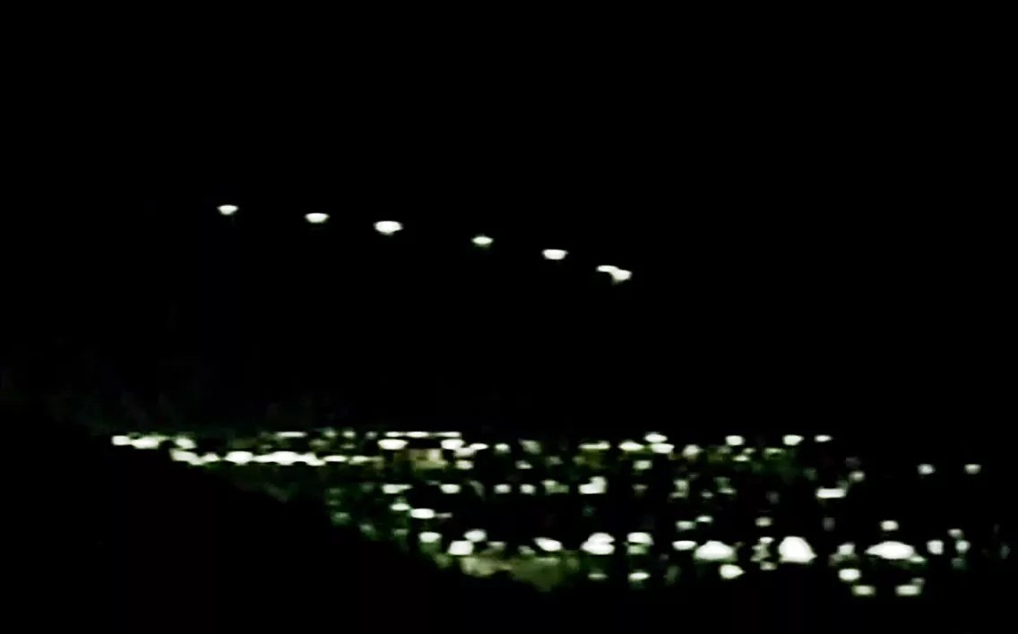 A screengrab of camcorder footage of the V-shaped formation of lights that appeared over the Valley on March 13, 1997.