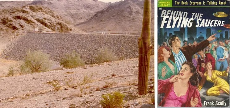 Left: a photo from a 1975 Army Corps of Engineers inspection report on the Dreamy Draw Dam. Right: the paperback edition of Frank Scully’s “Behind the Flying Saucers,” published in 1951.