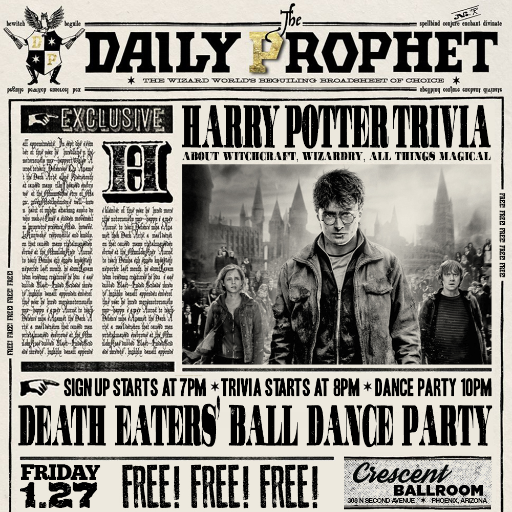 Get nerdy this Friday at Crescent Ballroom during an evening of Harry Potter events. At 8 p.m. on January 27, a trivia competition will start in the venue’s lounge. (Signup starts at 7 p.m.) Then, at 10 p.m. once you’ve tried your knowledge against other Potterheads, you can retire to the ballroom for a Death Eaters’ Ball Dance Party. We’re guessing that costumes will be welcome and appropriate for the evening. Crescent Ballroom is located at 308 North Second Avenue. Jennifer Goldberg