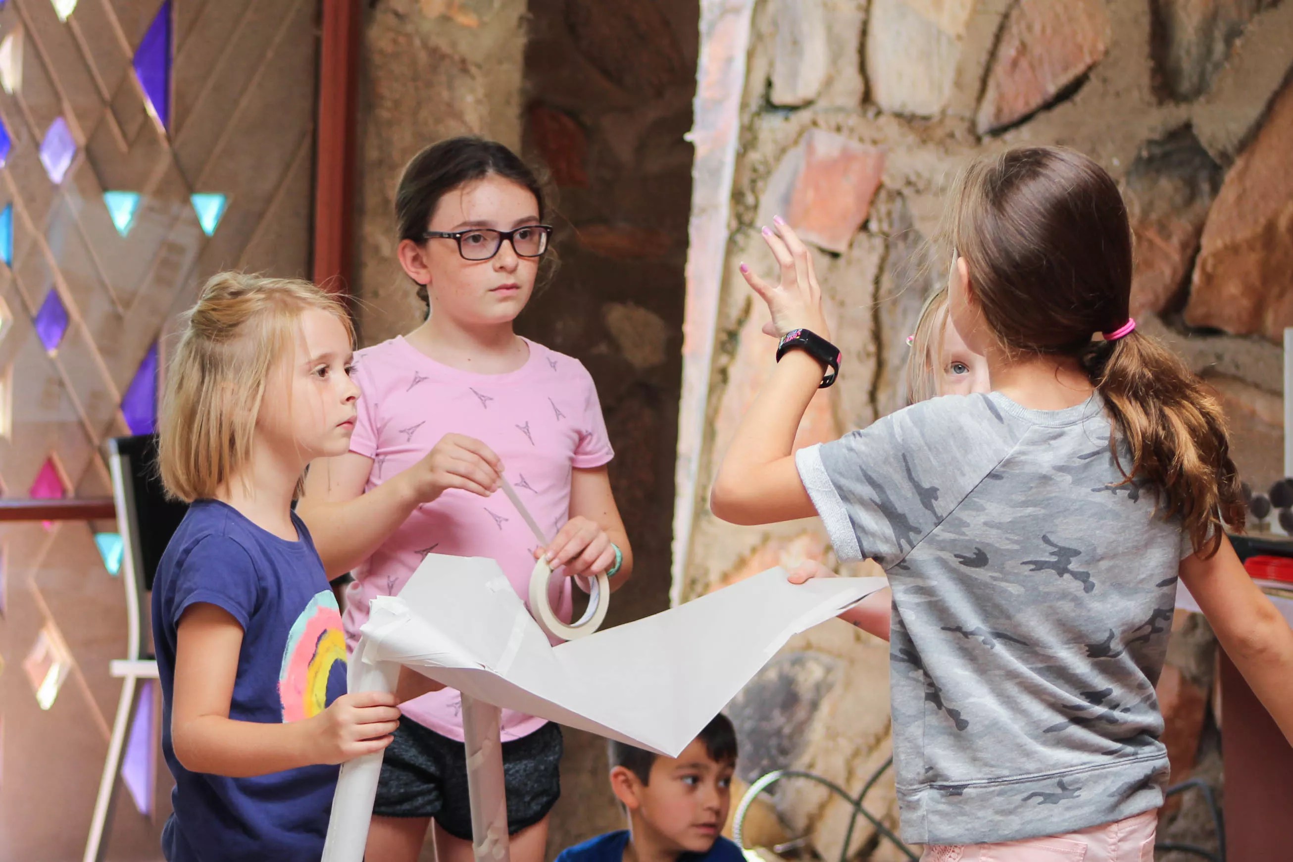 The program utilizes a variety of tools to motivate second- through fifth-graders. In each lesson, students are encouraged to use shapes in the design process, much like those educational toys that Wright employed throughout his professional life. Through a hands-on approach, they will learn to integrate nature with interior design and blend color and stained glass into the scenery, much like Wright did when he designed and built his home Taliesin West.