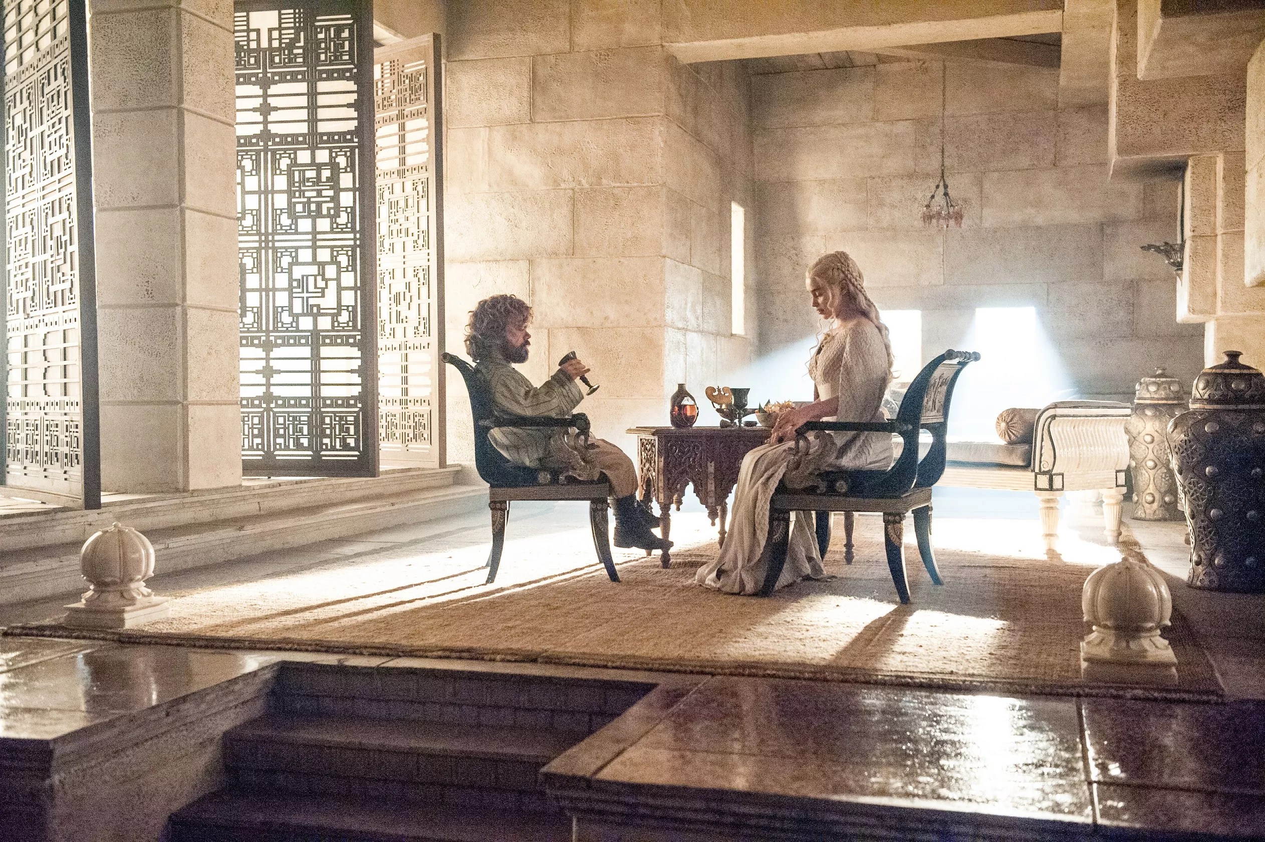 Tyrion Lannister (Peter Dinklage) and Daenerys Targaryen (Emilia Clarke) confer in Meereen Palace.