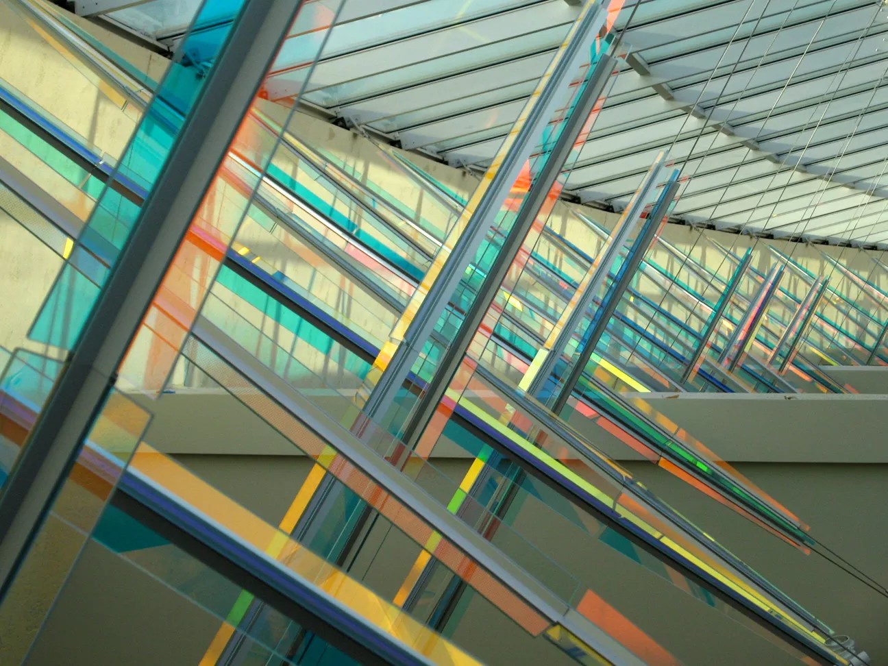 The Terminal 4 Station is home to a pair of Daniel Mayer works. His Variable Order terrazzo floor is located on the station platform, and his Trace Elements stained-glass murals are located on the pedestrian bridge. Each of the two 115-by-nine-foot murals consists of 28 laminated glass panels with a leaf motif. His eight-color floor includes recycled crushed mirror, as well as blue and clear glass. Inspired by letterpress printing, Mayer embedded 1,000 metal letters with a lower-case Garamond italic typeface – and included the two handwritten phrases: “timeless is the open” and “limitless is the open.”