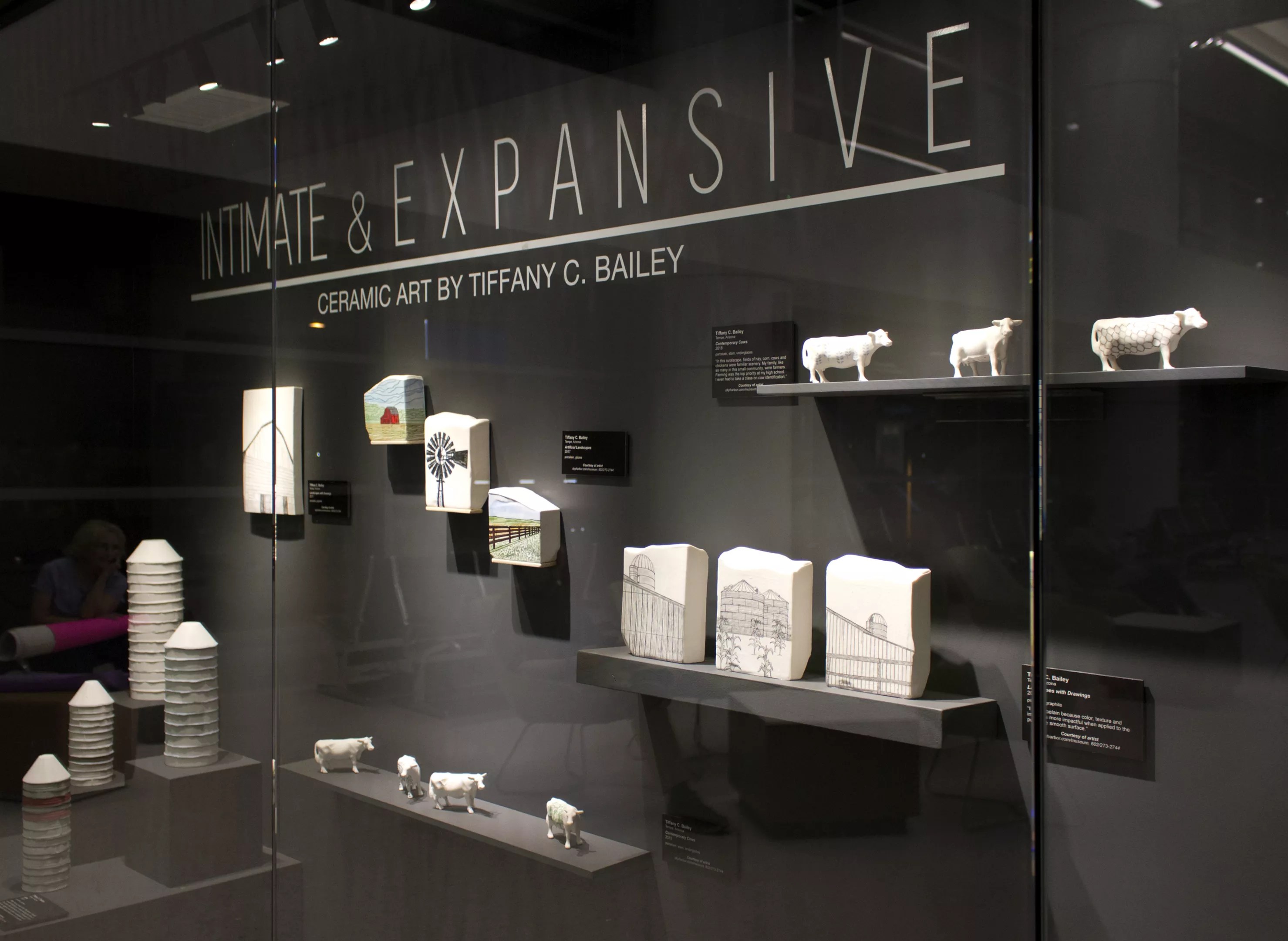 You’ll find “Intimate & Expansive: Ceramic Art by Tiffany C. Bailey” in the east arrivals area of level four. Bailey is a Tempe artist whose works, featuring iconic imagery from windmills to cows, are inspired by her Midwestern upbringing.