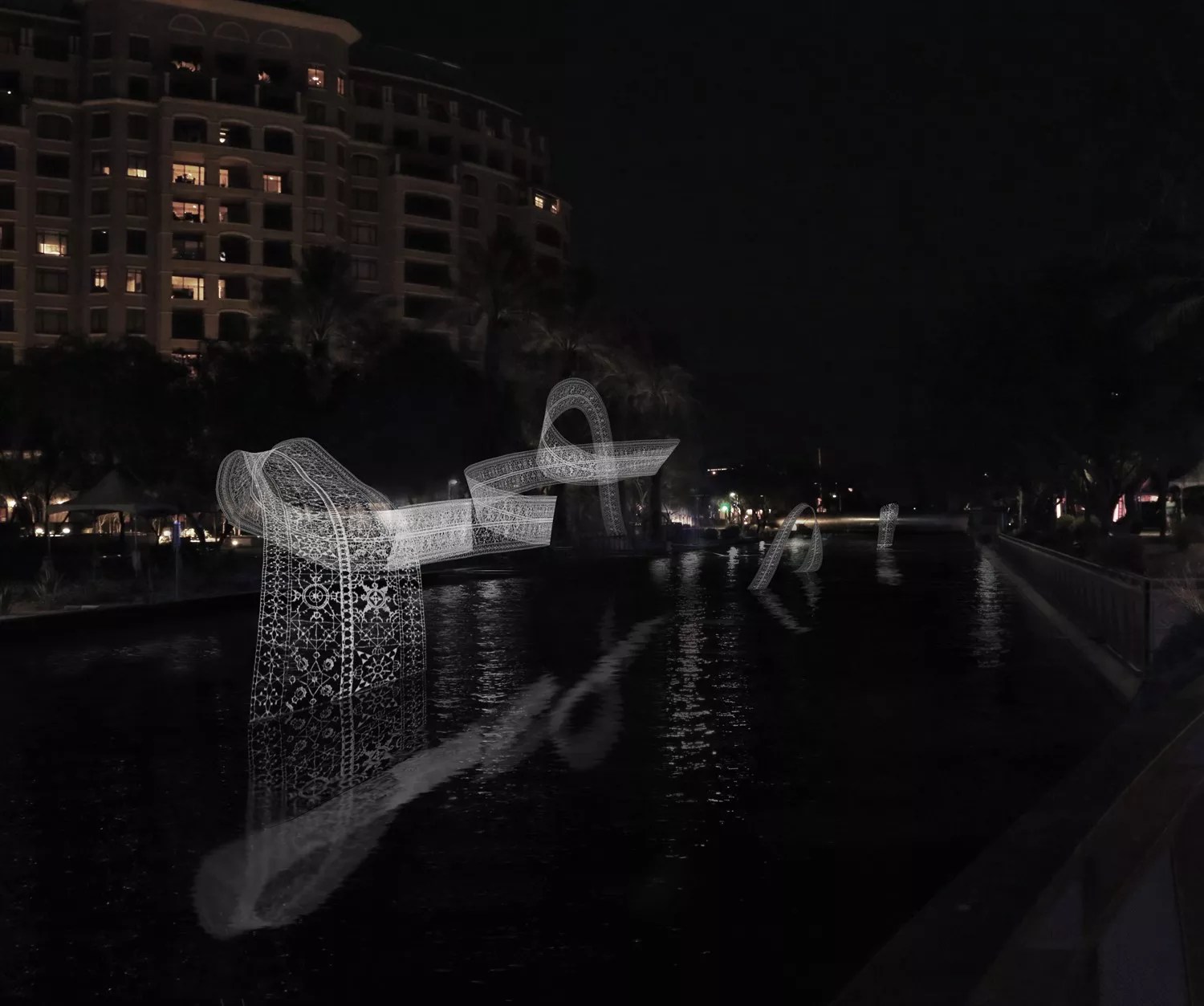 Choi + Shine Architects invited locals to participate in creating a giant hand-crocheted lace ribbon, which will be installed over and around the Arizona Canal. The ribbon, which measures 650 feet long and 8 feet wide, is interspersed with pieces crocheted by more than 100 people in Arizona, who got involved after the artists put out the call during February’s Canal Convergence. Artists Jin Choi and Thomas Shine have offices in Boston, London, and Seoul.