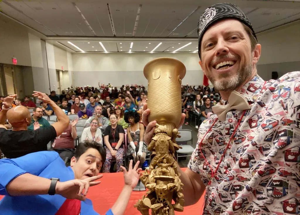 Want to make like the crew from “Star Trek: The Next Generation” and attend a late-night poker sesh? This 18-and-over charity tournament from 8 p.m. to 1 a.m. on Friday, June 2, in West 106ABC benefits local nonprofit Kids Need to Read and will involve no-limit games of Texas Hold’em for prizes. You might even see a special guest or two playing. The buy-in is $20 per person. Registration is at 7 p.m. Jeff Moriarty (right) with the Phoenix Ultimate Geek Smackdown trophy. Jeff Moriarty