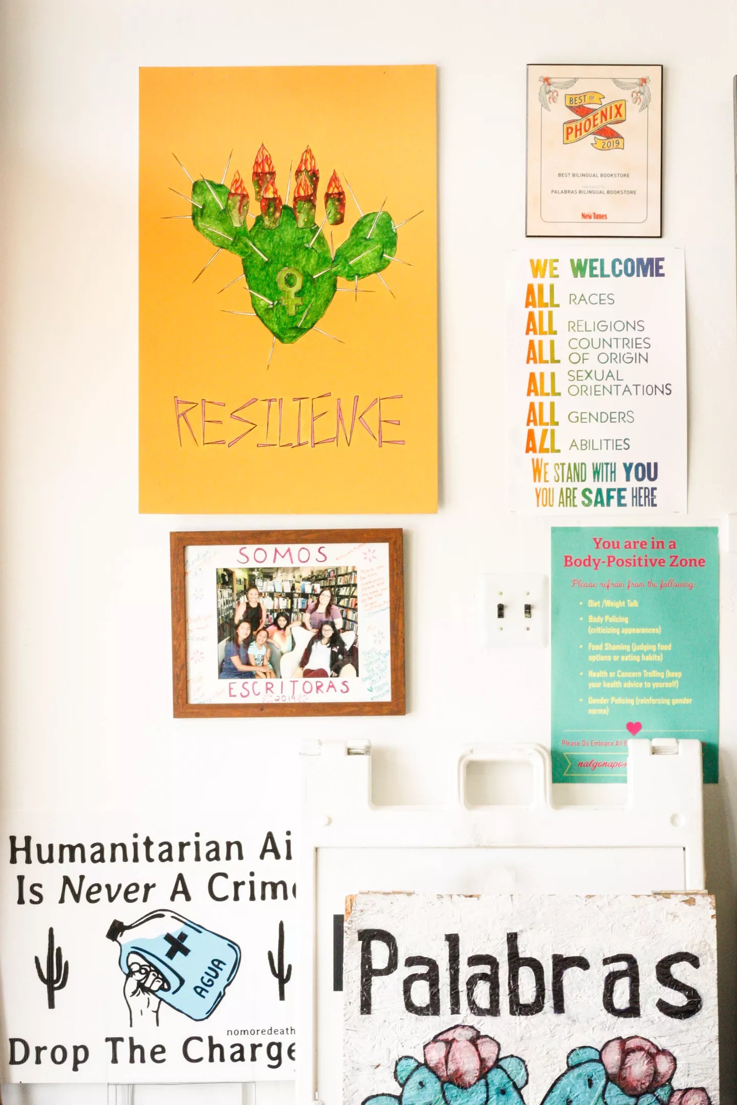 A set of posters and signs greeting those who enter Palabras Bilingual Bookstore.