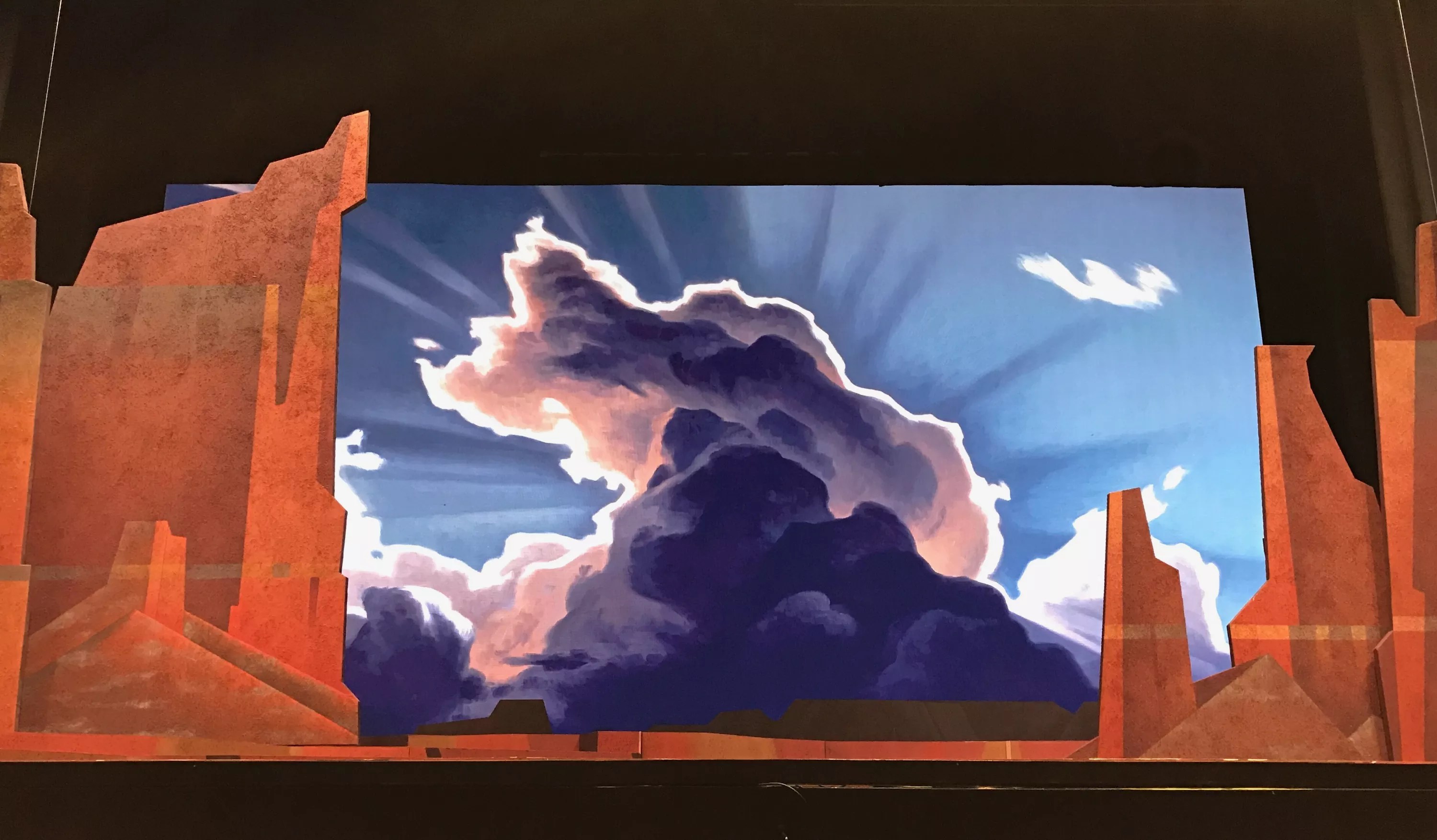That’s because Arizona Opera purchased a gigantic 26-by-51-foot video wall that anchors the Riders of the Purple Sage set. Which means that scenes feature Mell’s paintings, both projected on the screen and painted on several 28-foot panels that flank the stage.