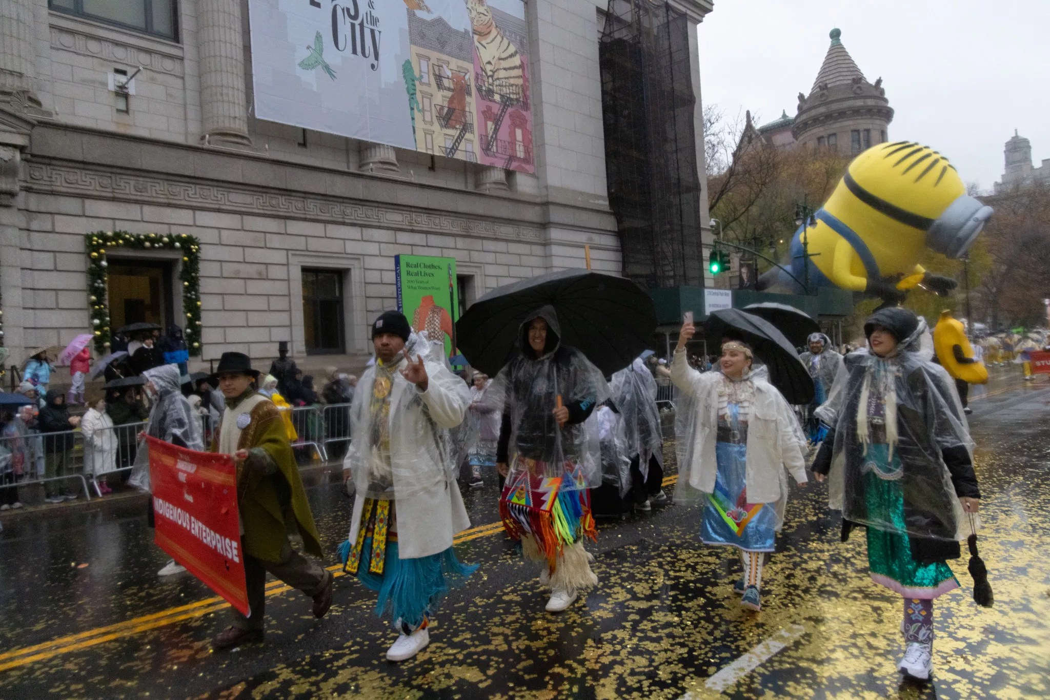 The Indigenous Enterprise dance troupe braves the cold rain falling on the Macy’s Thanksgiving Day Parade, their regalia glistening as they wave to cheering crowds lining the streets.