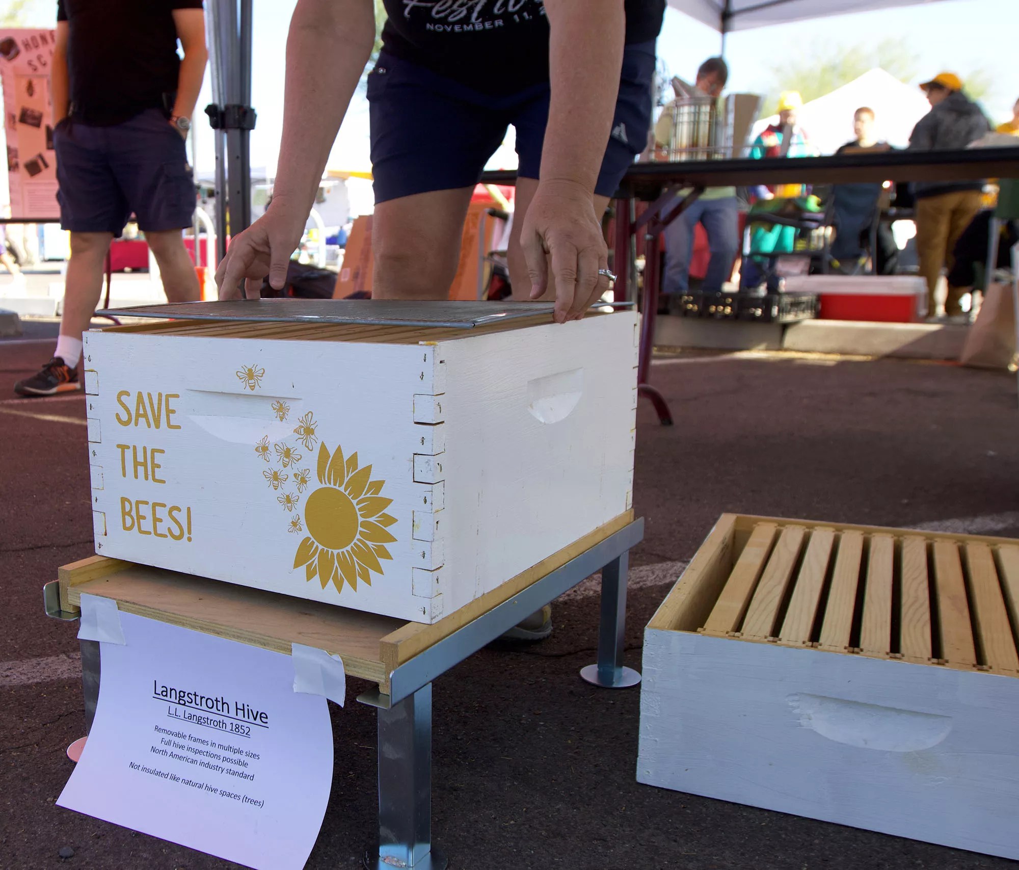 Prescott beekeepers show off their wooden beehive display at the November 2023 Arizona Honeybee Festival in Phoenix. They relocate beehives and provide beekeeping education.
