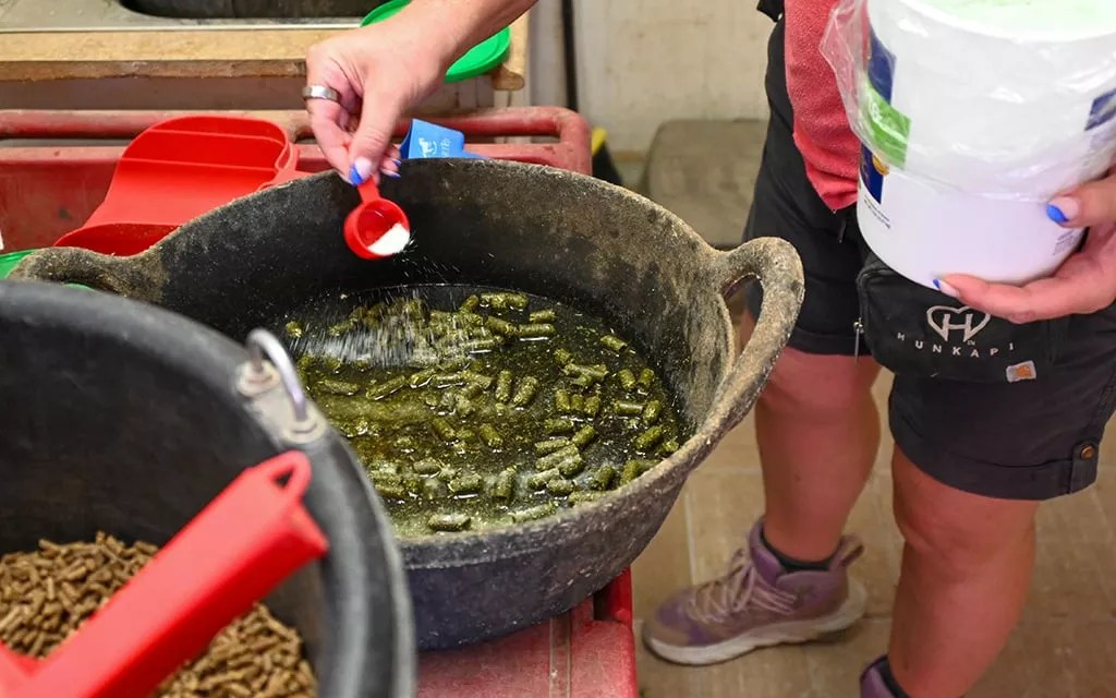 Jen Olsen, herd care specialist, sprinkles electrolytes over horse food pellets at Hunkapi Farm. Horses require electrolytes during the hot summer months to ensure they are hydrated throughout the day.