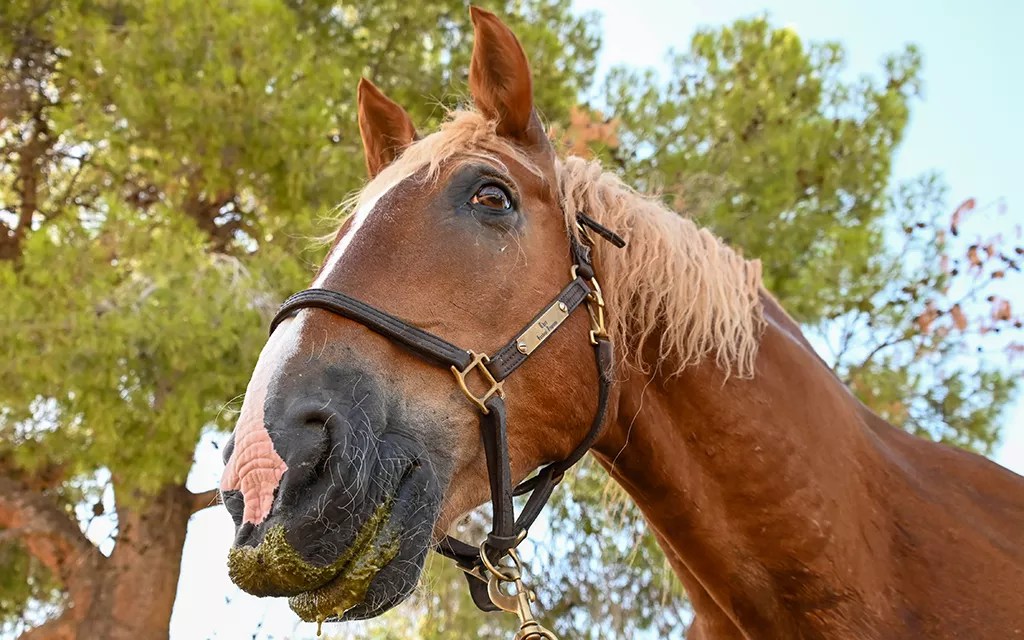 Thor, a therapy horse, looks up after taking a bite of food at Hunkapi Farm. Hunkapi is a 10-acre farm home to more than 30 therapy horses, chickens, cows, donkeys and more during the spring season.