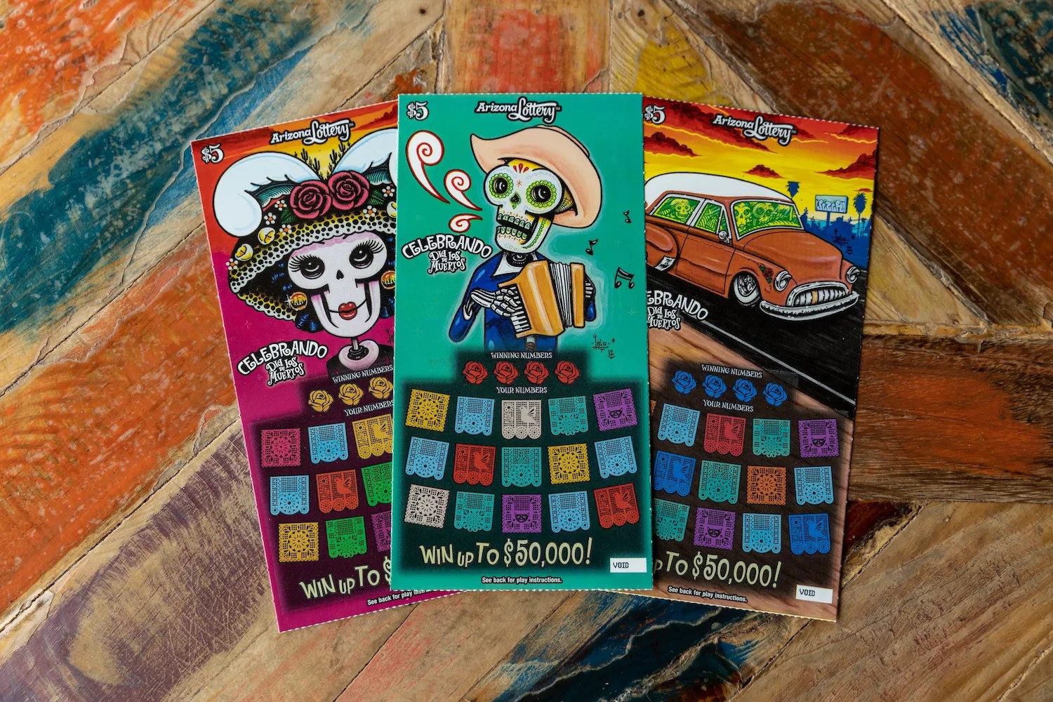 Several new Arizona Lottery scratcher tickets include artwork Lalo Cota, whose murals dotting the downtown landscape incorporate skulls and other traditional Mexican imagery. The tickets cost $5 and the highest prize is $50,000.