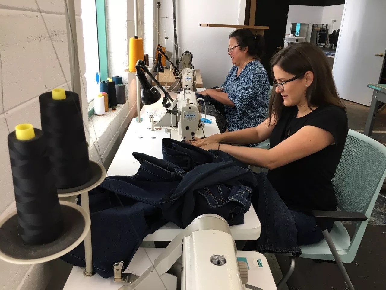Saskia Jorda (right) sews part of her IN FLUX Cycle 7 installation.