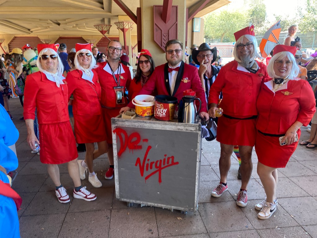 Mile-High Club leaned into the bit just as hard. The team repurposed an airline beverage cart and dressed as flight attendants. They stayed in character while pushing their cart and offering drinks to fellow racers. In-flight service was enthusiastic.