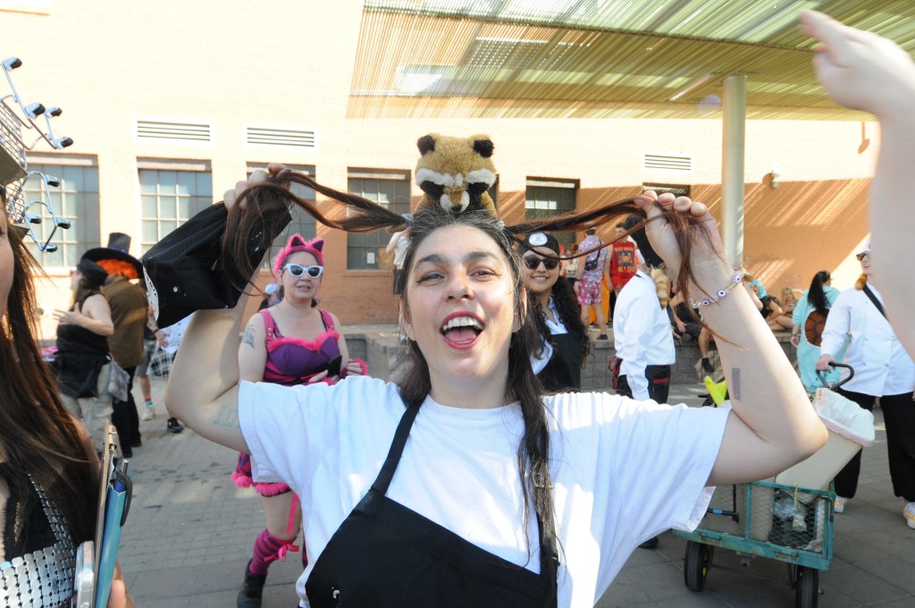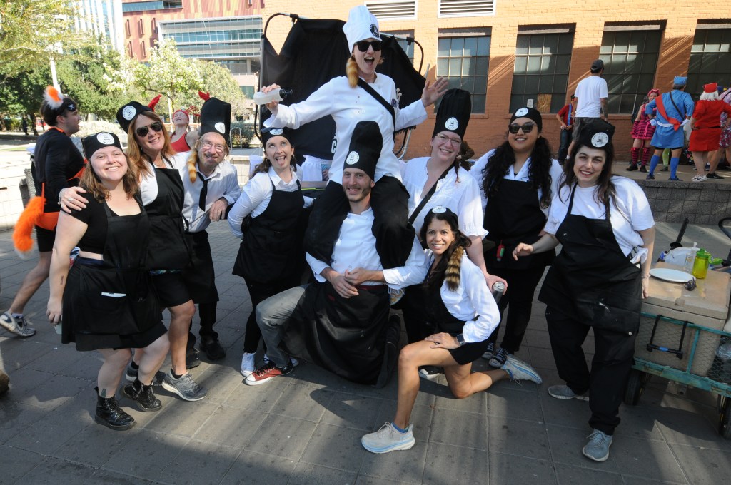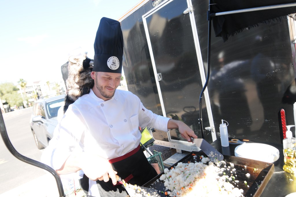 Several teams went far beyond duct tape and decorations. Racacoonie, inspired by “Everything Everywhere All at Once,” brought one of the most ambitious builds of the day. Their cart doubled as a rolling teppanyaki-style hibachi, nodding to one of the Oscar-winning film’s most memorable scenes. During a pit stop at downtown bar Bacanora, they even cooked and served shrimp fried rice to fellow racers.