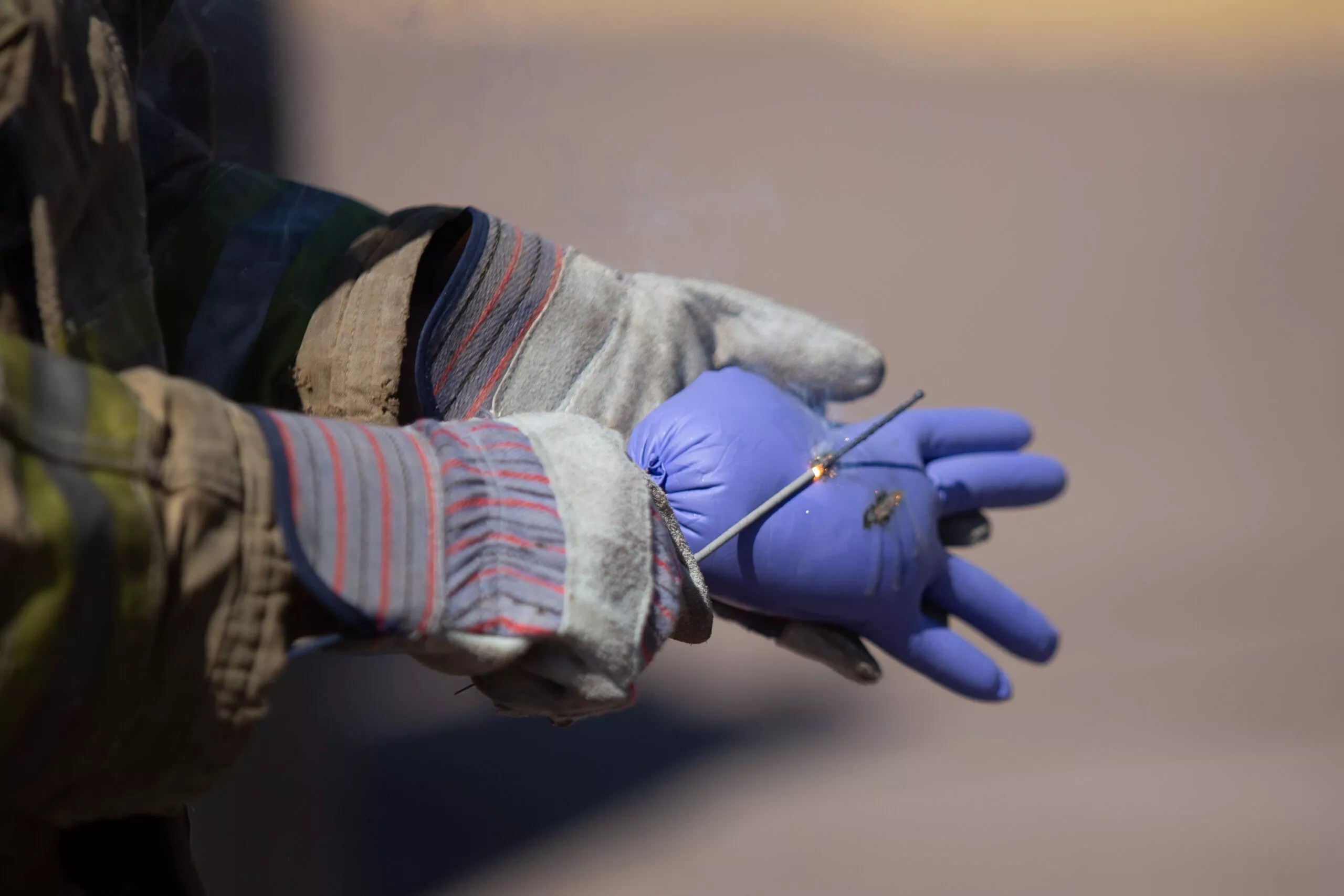 Steve Petrie, a fire inspector for Phoenix Fire Department, presses a sparkler against a glove filled with ground beef to demonstrate what could happen to your skin. Many consumer-grade sparklers burn at over 1,200 degrees Fahrenheit.