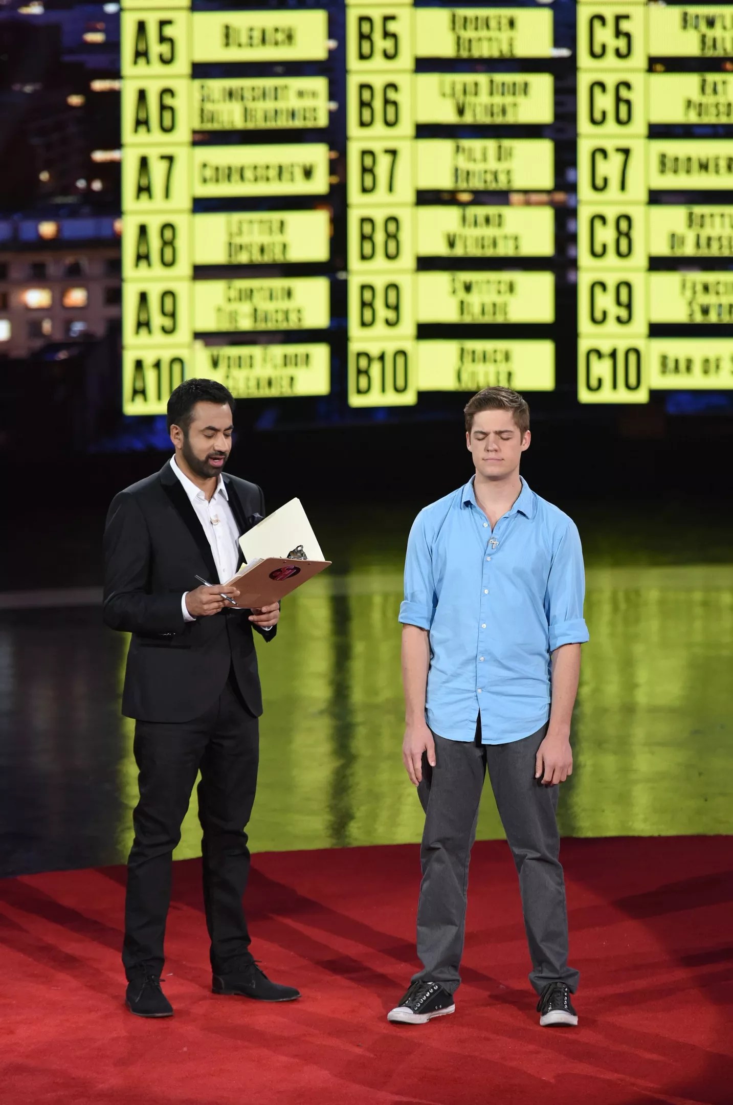 Kaden Taylor (R) tests his memory as host Kal Penn (L) leads him through a challenge on