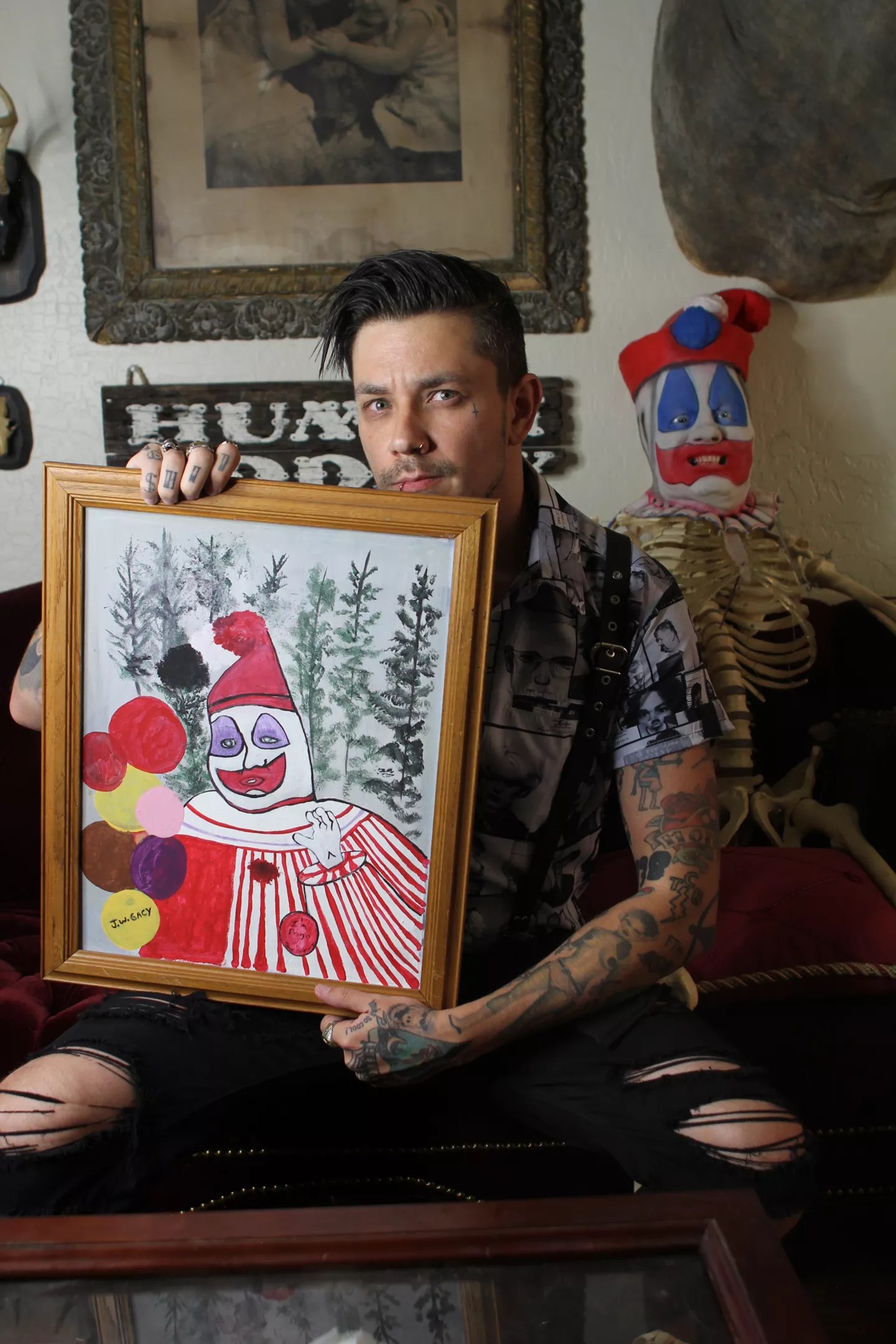 Autry shows off an authentic John Wayne Gacy “Pogo the Clown” painting, just one of the pieces of serial killer memorabilia that fill his home.