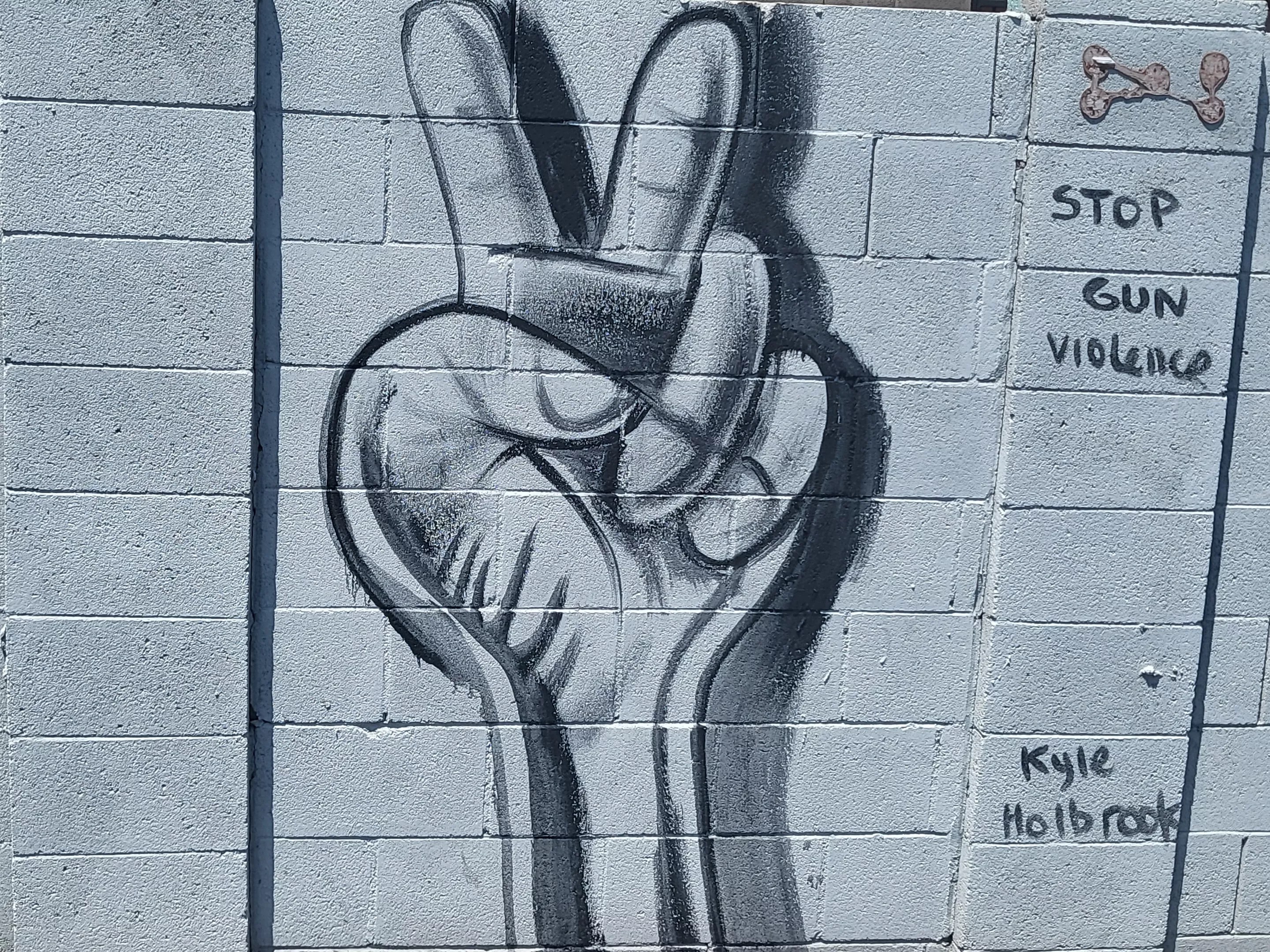 As part of his Gun Violence Awareness National Tour, the painting depicts a left hand doing a peace sign with the words “stop gun violence” right next to it. In comparison to some of Holbrook’s massive murals, the artwork is modest. But he says that’s the point.