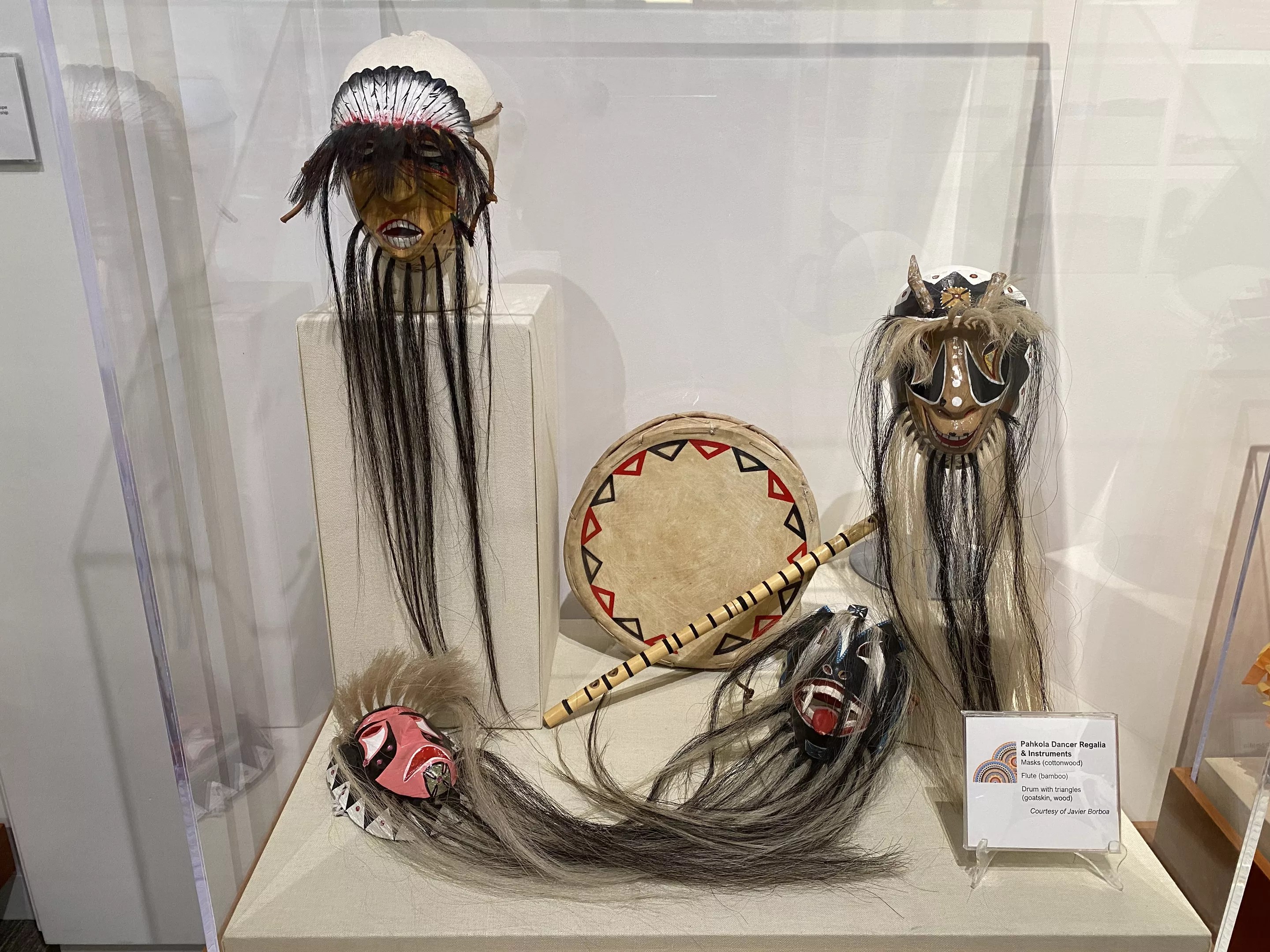 Pahkola Dancer regalia and instruments — masks, flute, and drum — are among many ceremonial objects loaned by the community of Guadalupe for the exhibit at Tempe History Museum.